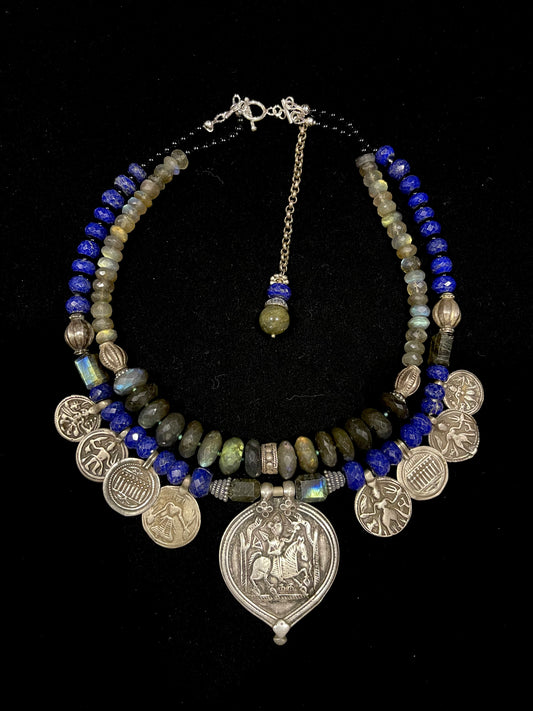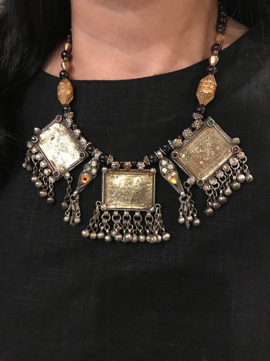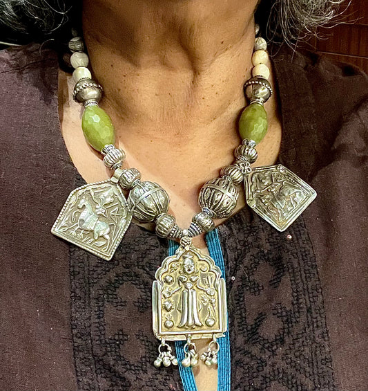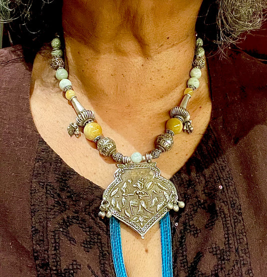 Antique Indian silver pendant with old silver, antique Hebron beads, antique Venetian glass beads, old silver beads and wooden beads
