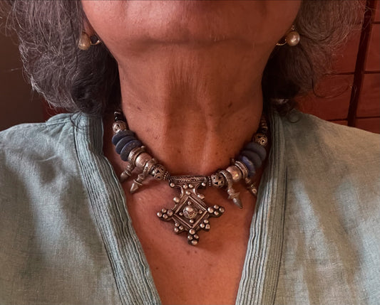 Antique silver fibula from east Algeria Strung with Turquoise -lapis lazuli and old silver.