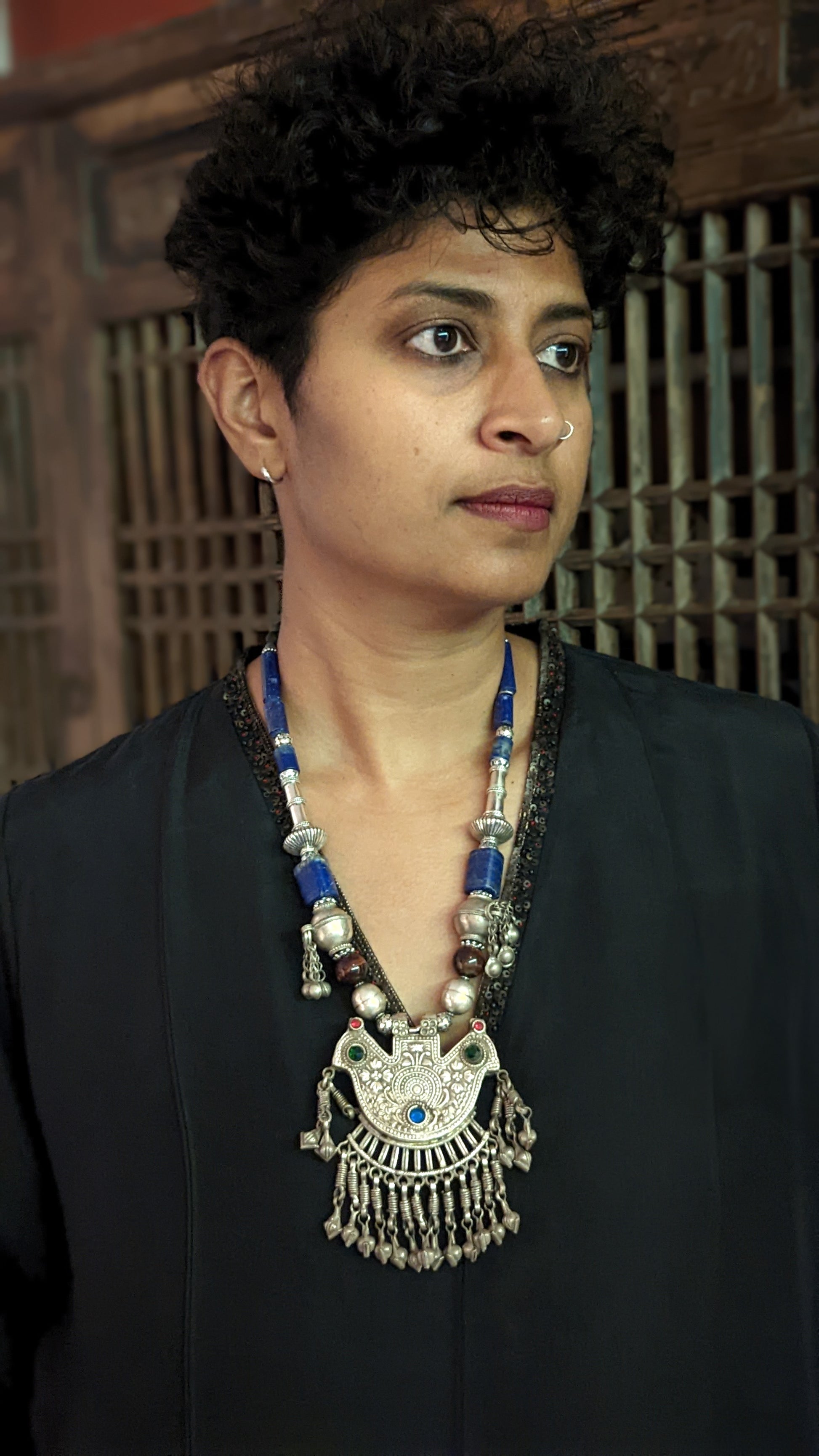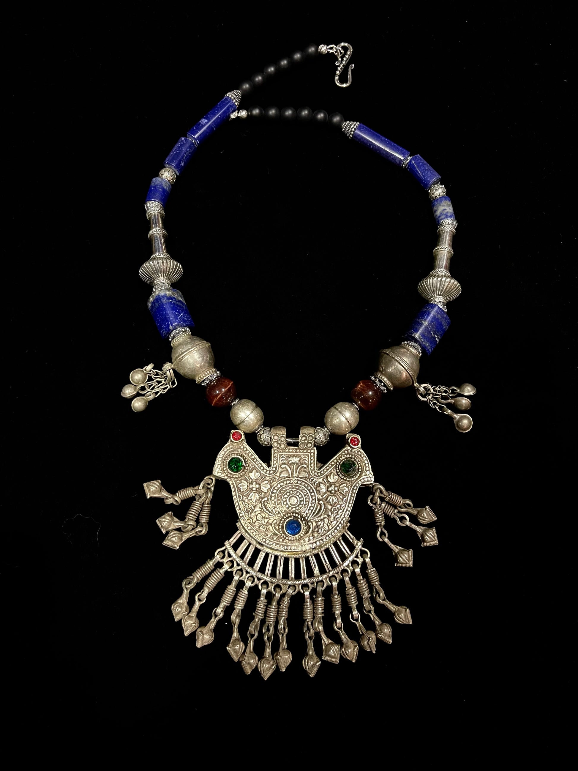 Vintage Afghan silver Bird pendant, strung with old silver Afghan beads and Lapis lazuli.