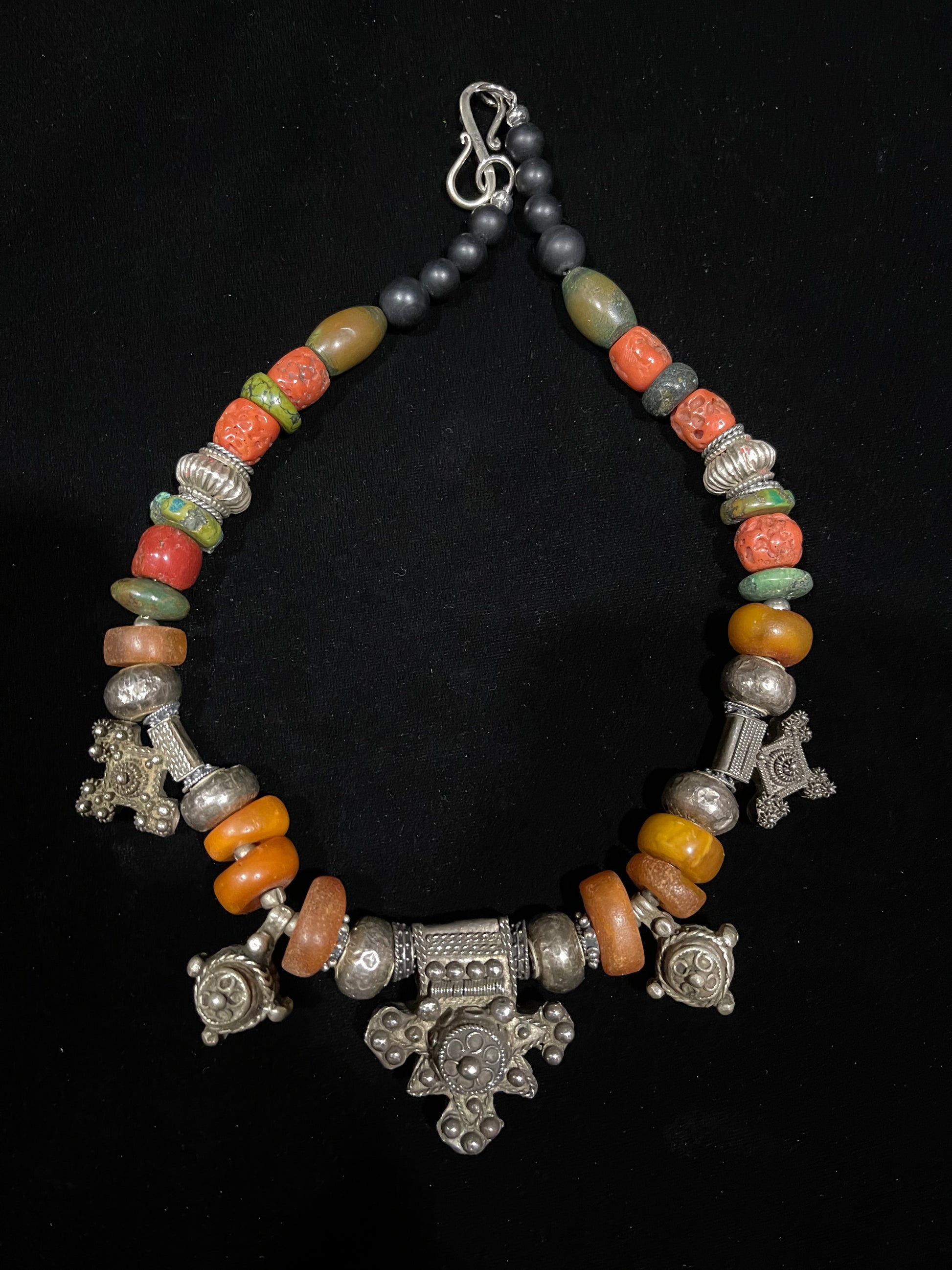 Antique silver Agadez cross pendants. Strung with old silver, Antique Butterscotch Amberand Mediterranean coral