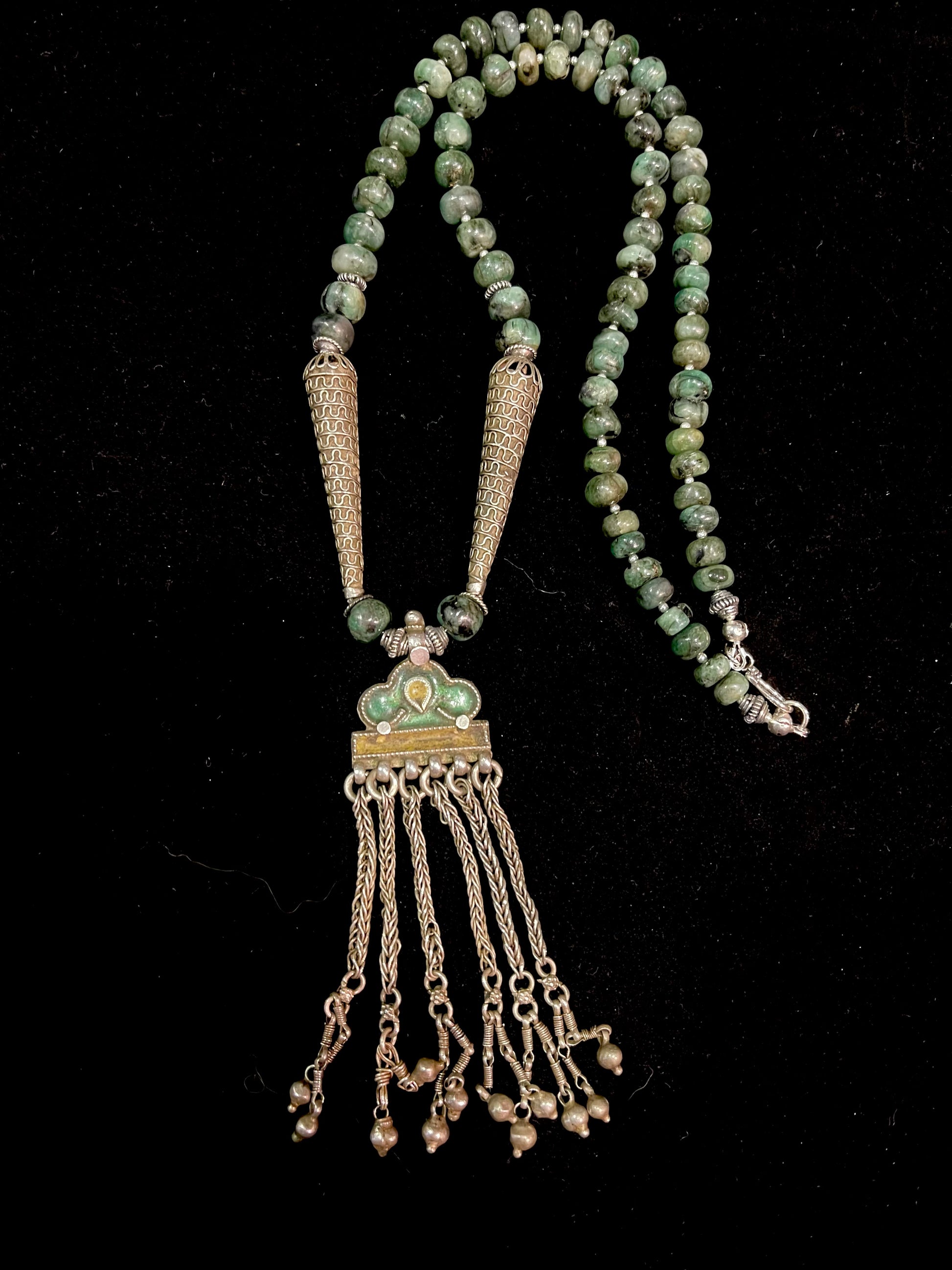 Antique Chinese enameled earring used as the pendant in this necklace. Strung with unpolished Emerald nugget beads and antique Yemeni tube beads.
