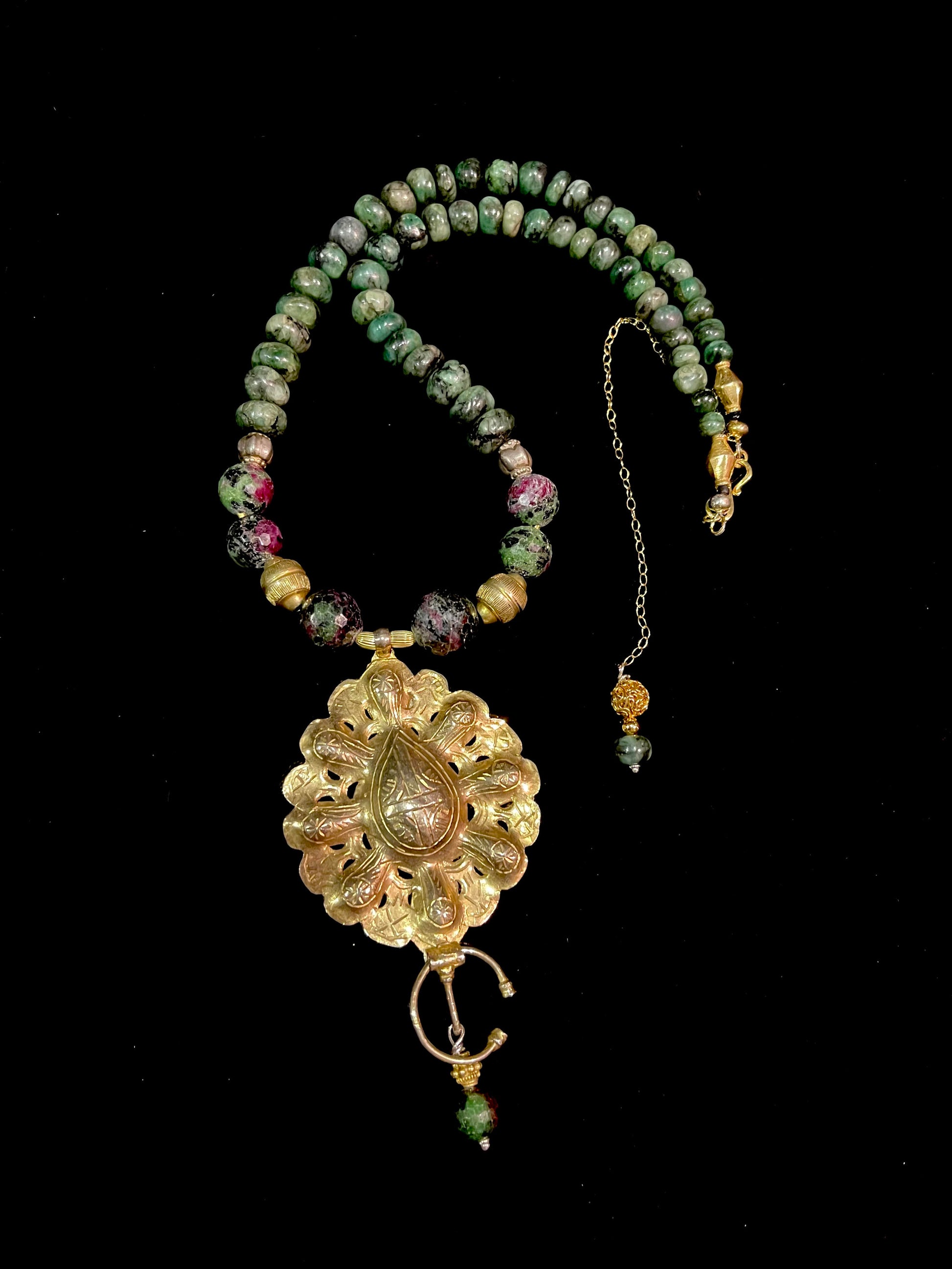 A delicate vintage silver gold washed fibula from Morocco - strung with emerald nugget beads, Ruby zoisite beads and antique silver gold washed Sri Lankan beads.