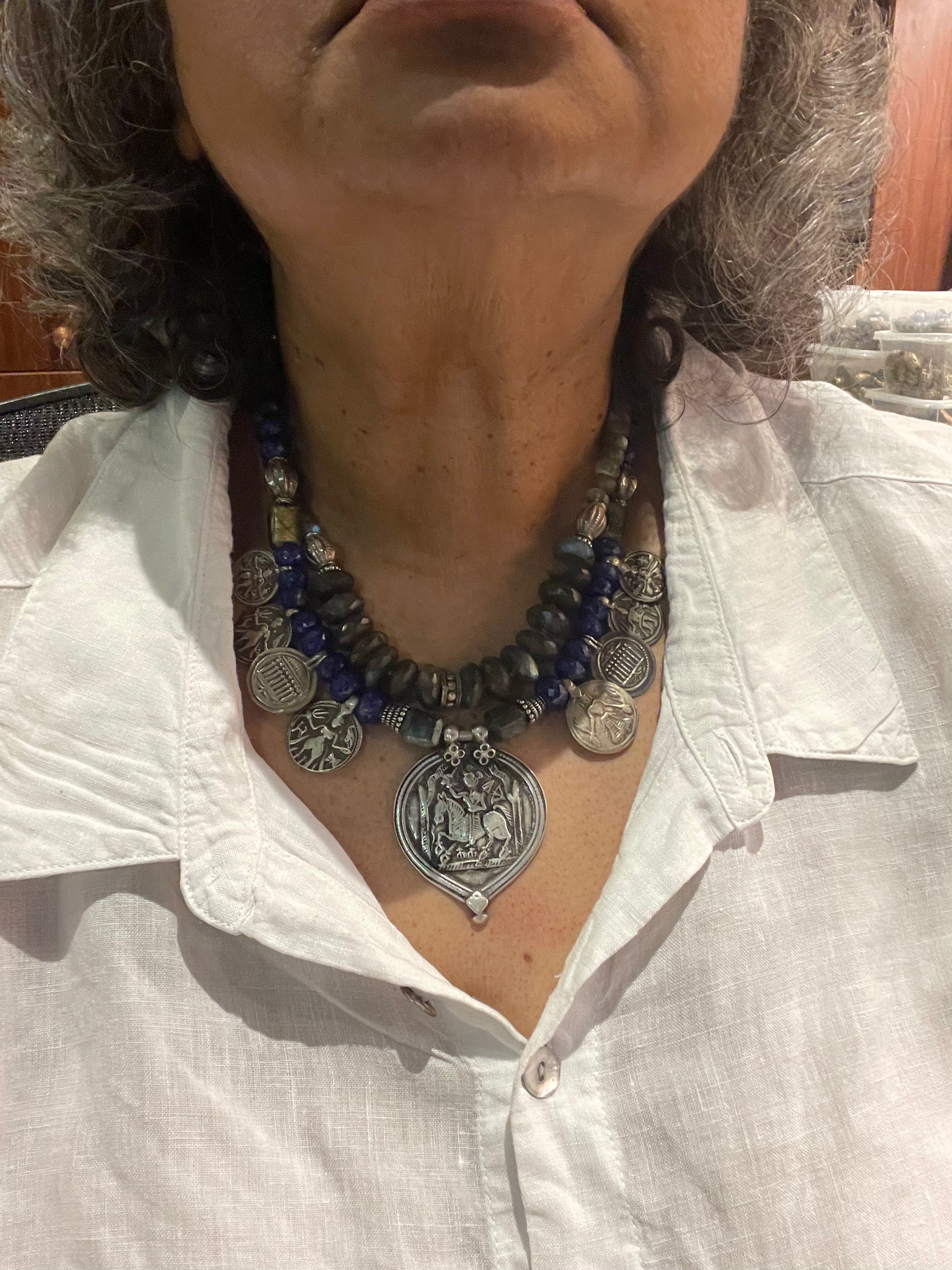 Antique Indian silver Patri pendants, strung with Labradorite, old silver and lapis lazuli