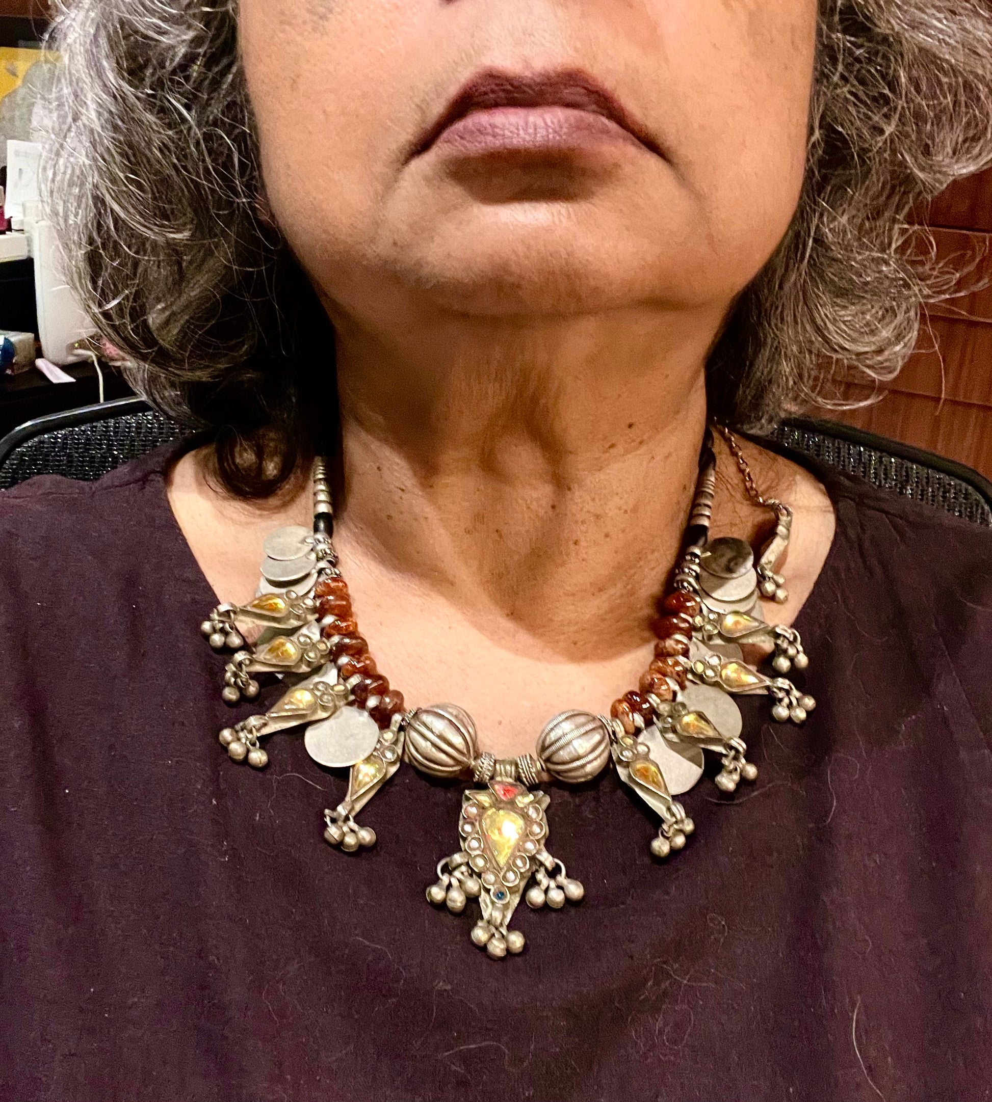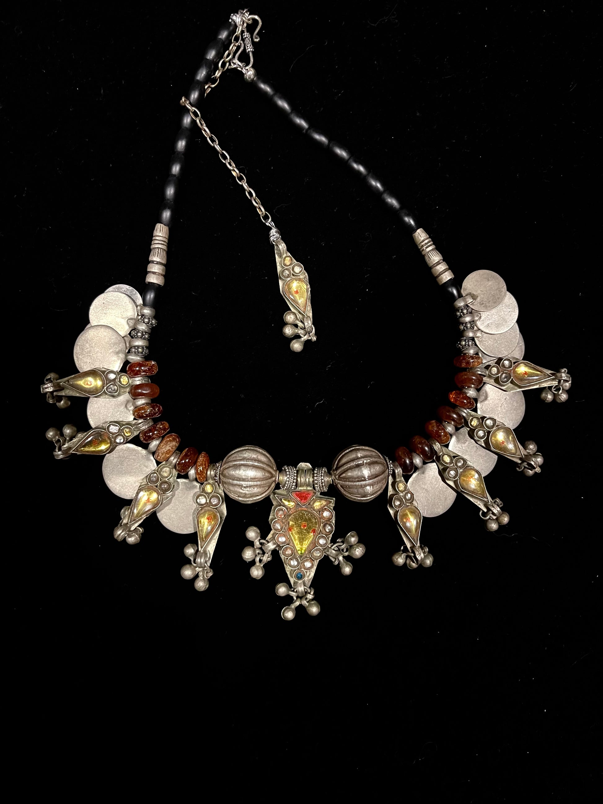 Antique Indian silver coins with old glass pendants - strung with old silver and onyx