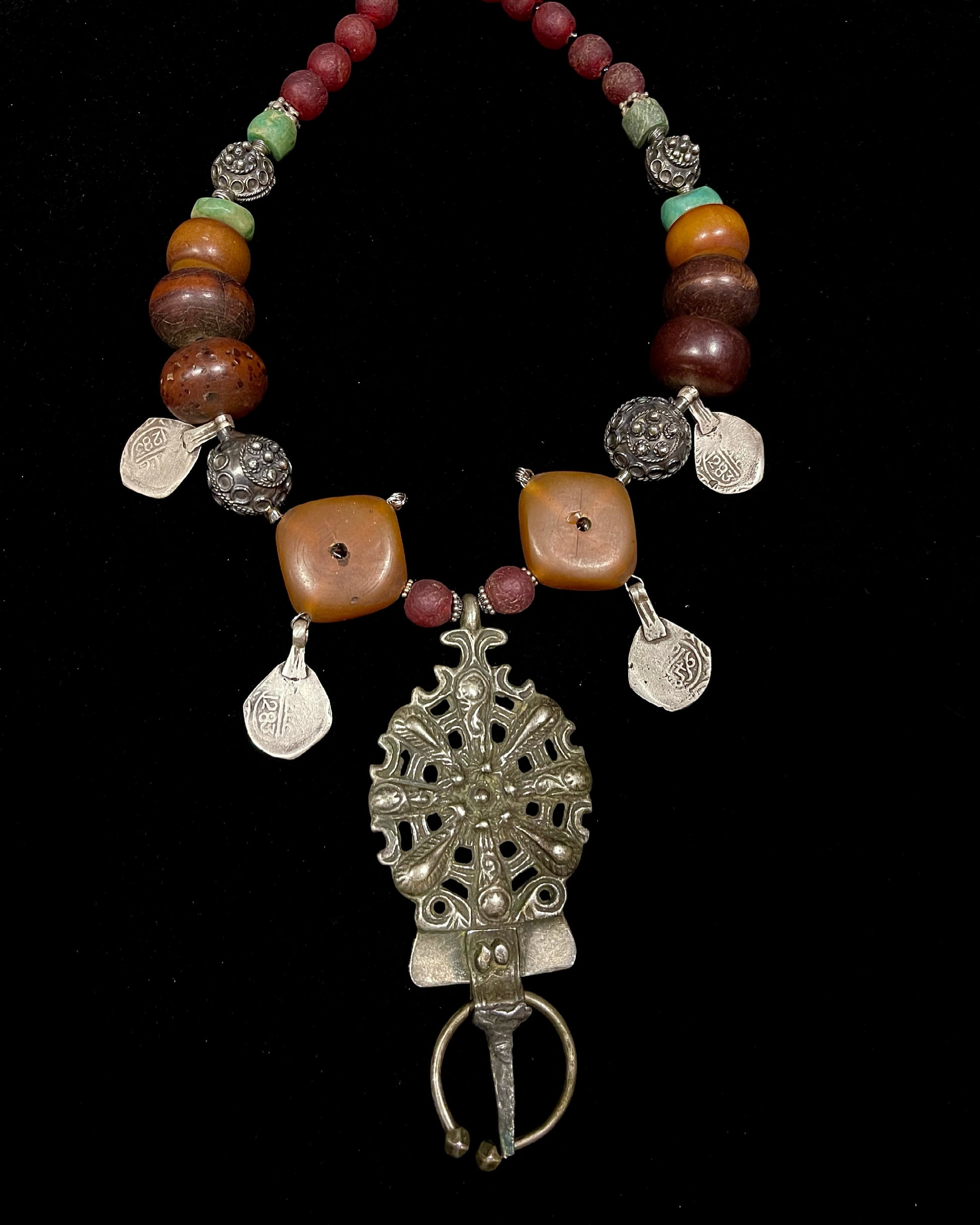 Antique silver fibula from Morocco. Strung with old cross drilled phenolic resin , silver coin pendants from Morocco and silver beads from Essaouria.