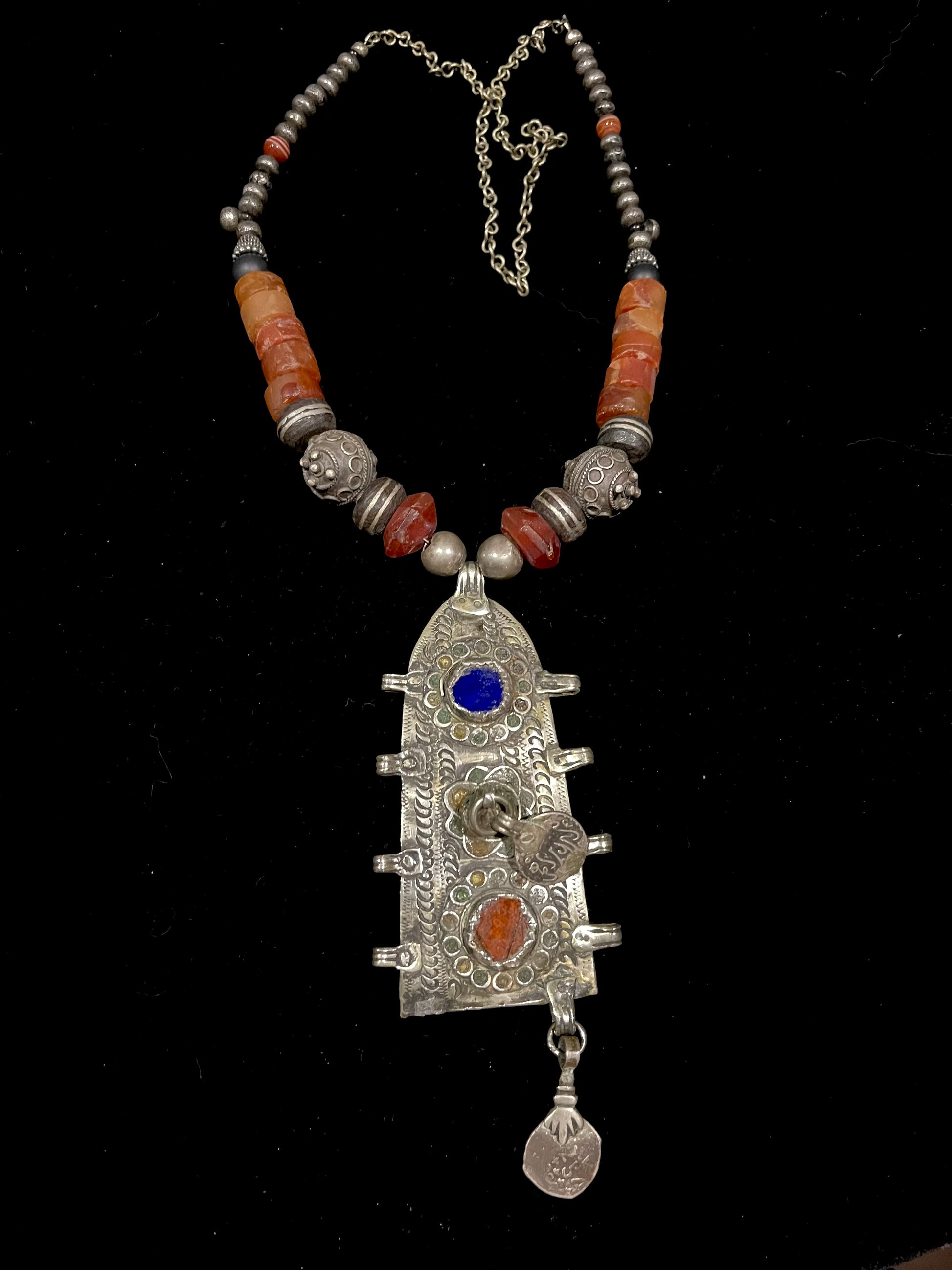 Antique Moroccan Headdress element as the pendant - strung with old carnelian , old silver Berber beads, black prayer beads and silver chain