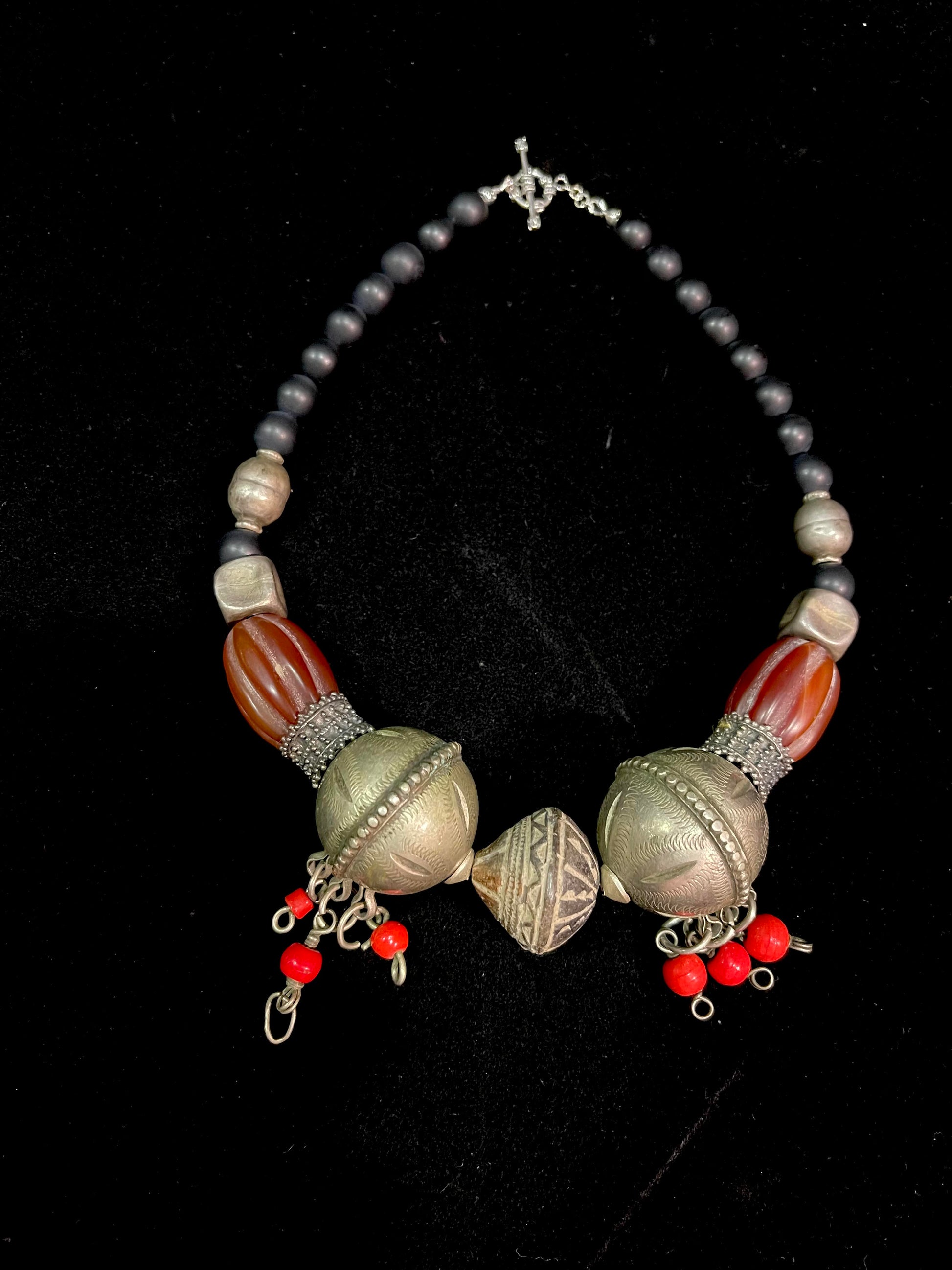 Antique Moroccan silver beads, antique Maki clay whorl bead, Carnelian and old silver with matte black agates