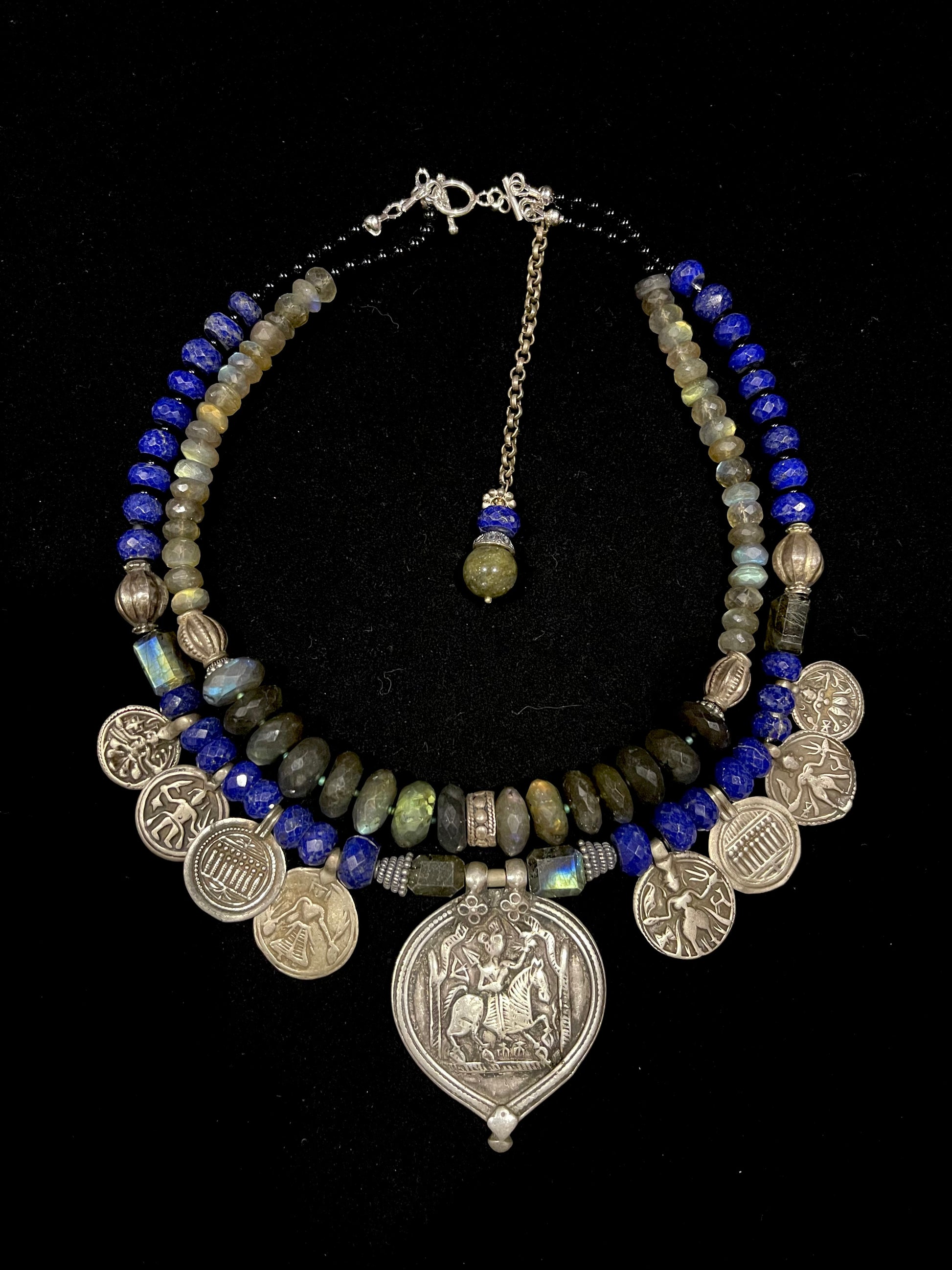 Antique Silver Patri pendants with old silver labradorite and lapis lazuli