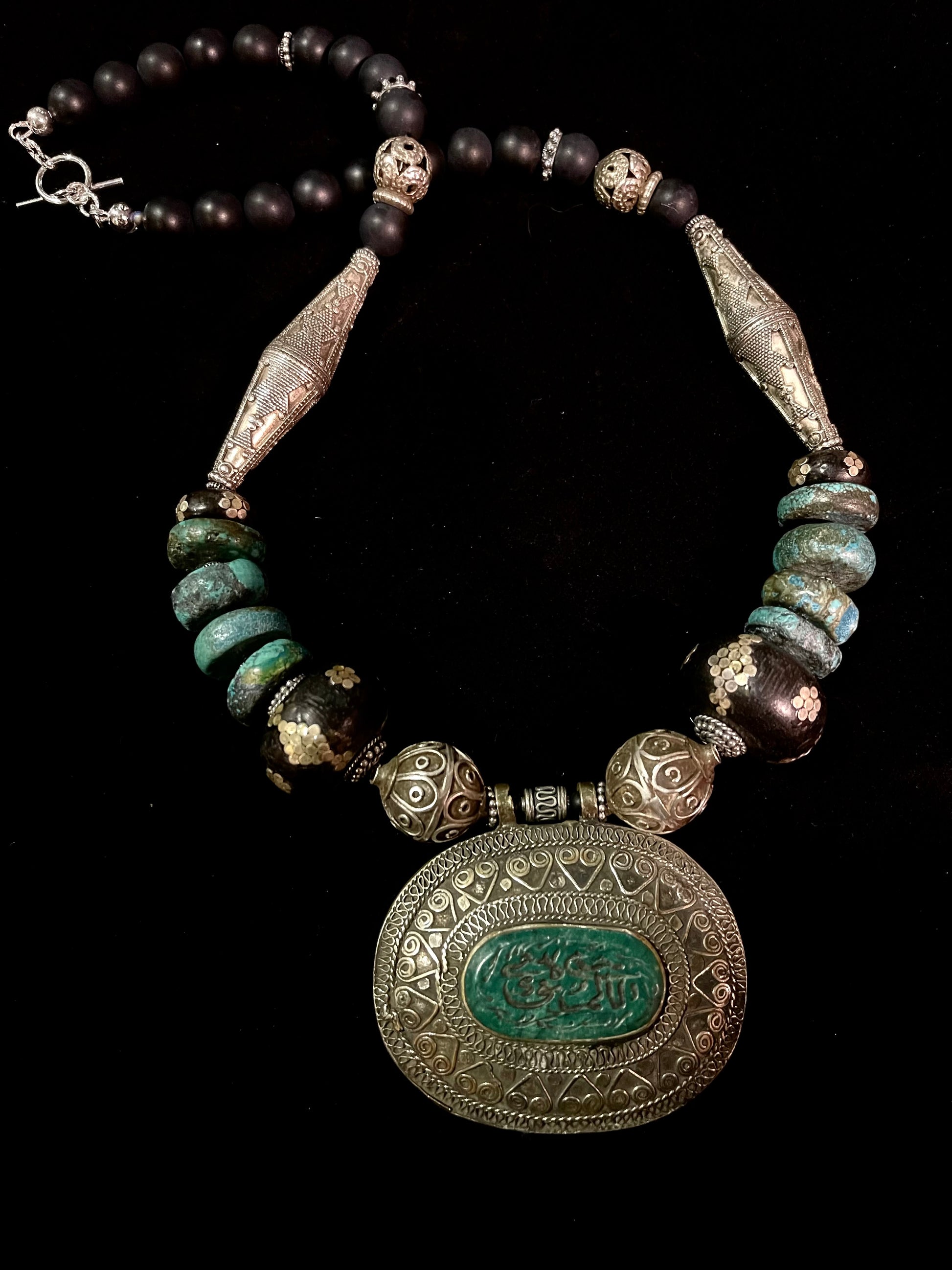 Beautiful antique pendant from Turkey - with an inset of turquoise. Strung with old silver turkoman Bicone beads, silver beads and wooden beads with beaten silver inlay