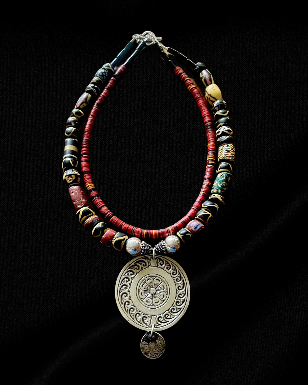 Antique Venetian glass beads and vintage vinyl disc beads with a silver Moroccan disc pendant.