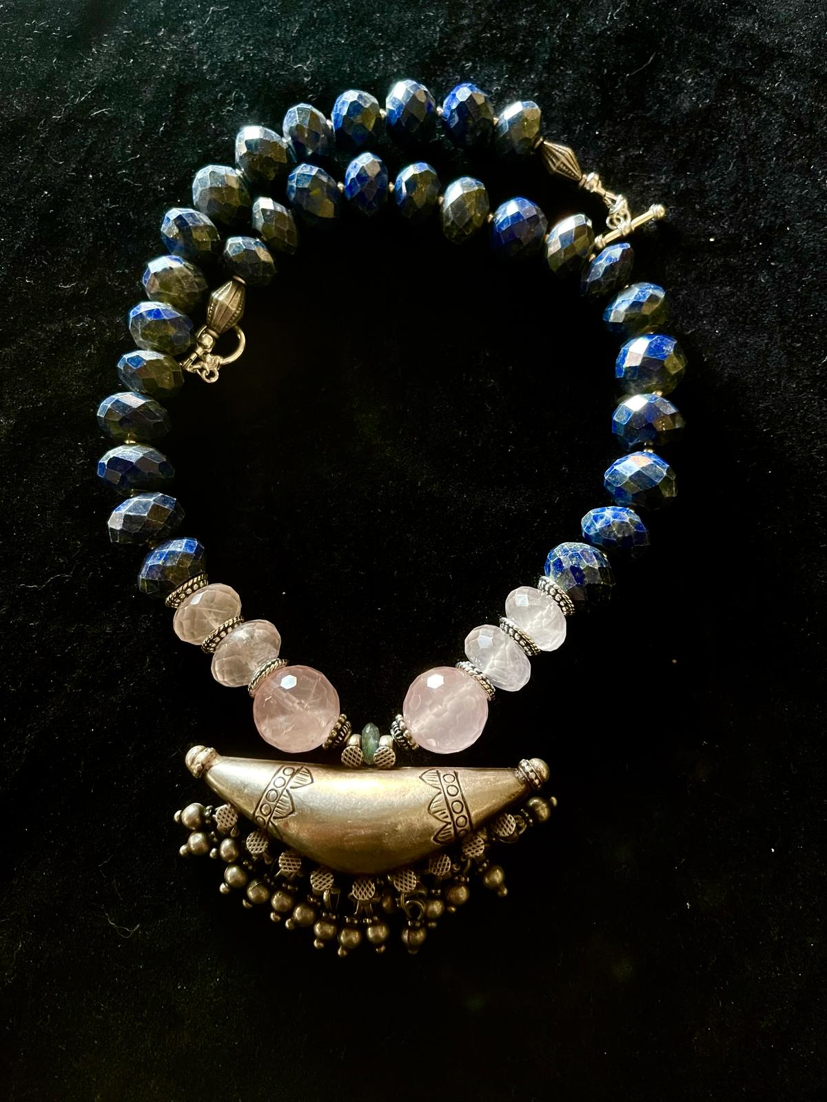 Antique silver amulet from Rajasthan India. Strung with faceted Lapis Lazuli, Rose quartz and silver beads