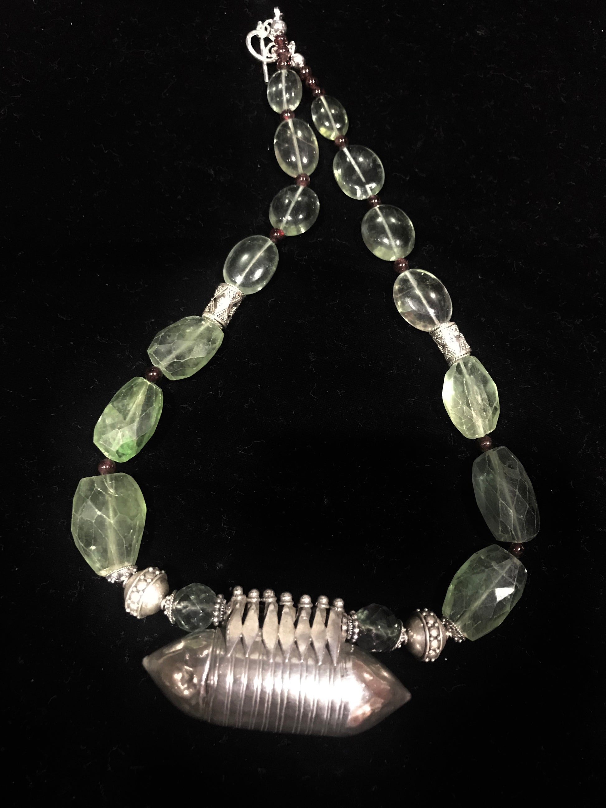 (openable) from Karnataka, South India, strung with green Fluorite nuggets and cabochons, with garnets.