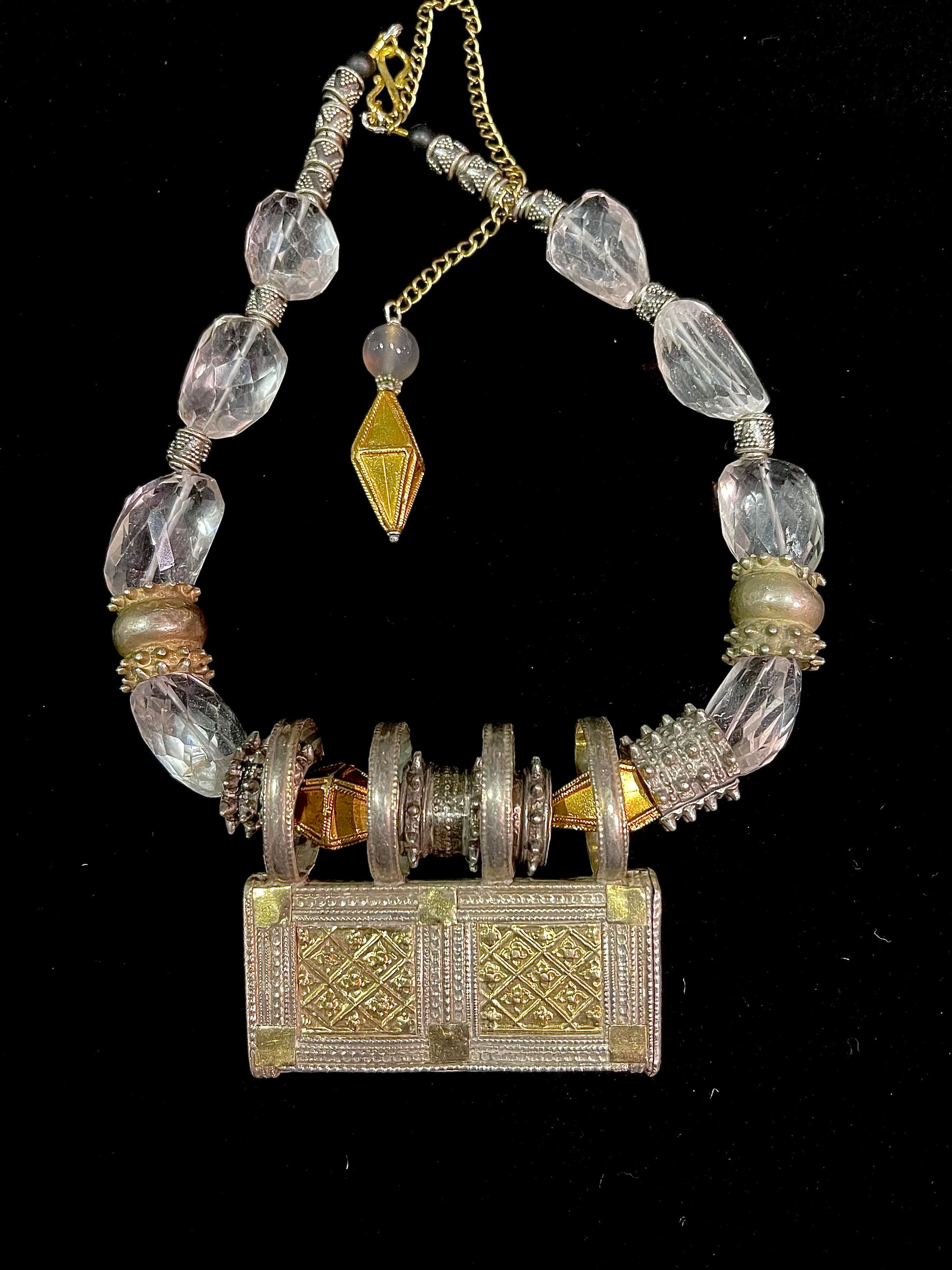 Antique silver and gold plated Omani pendant, strung with crystal quartz beads and antique Omani silver beads