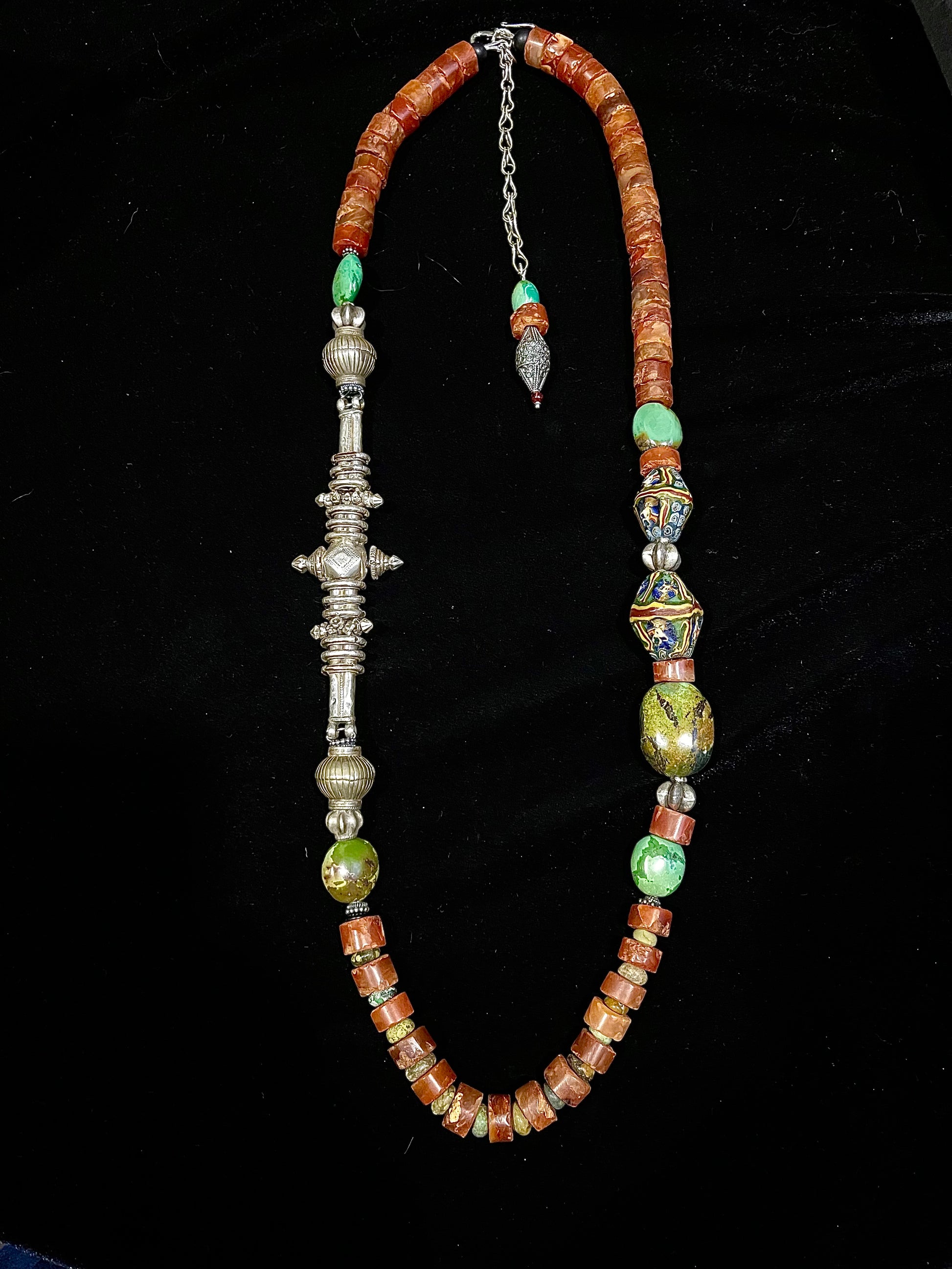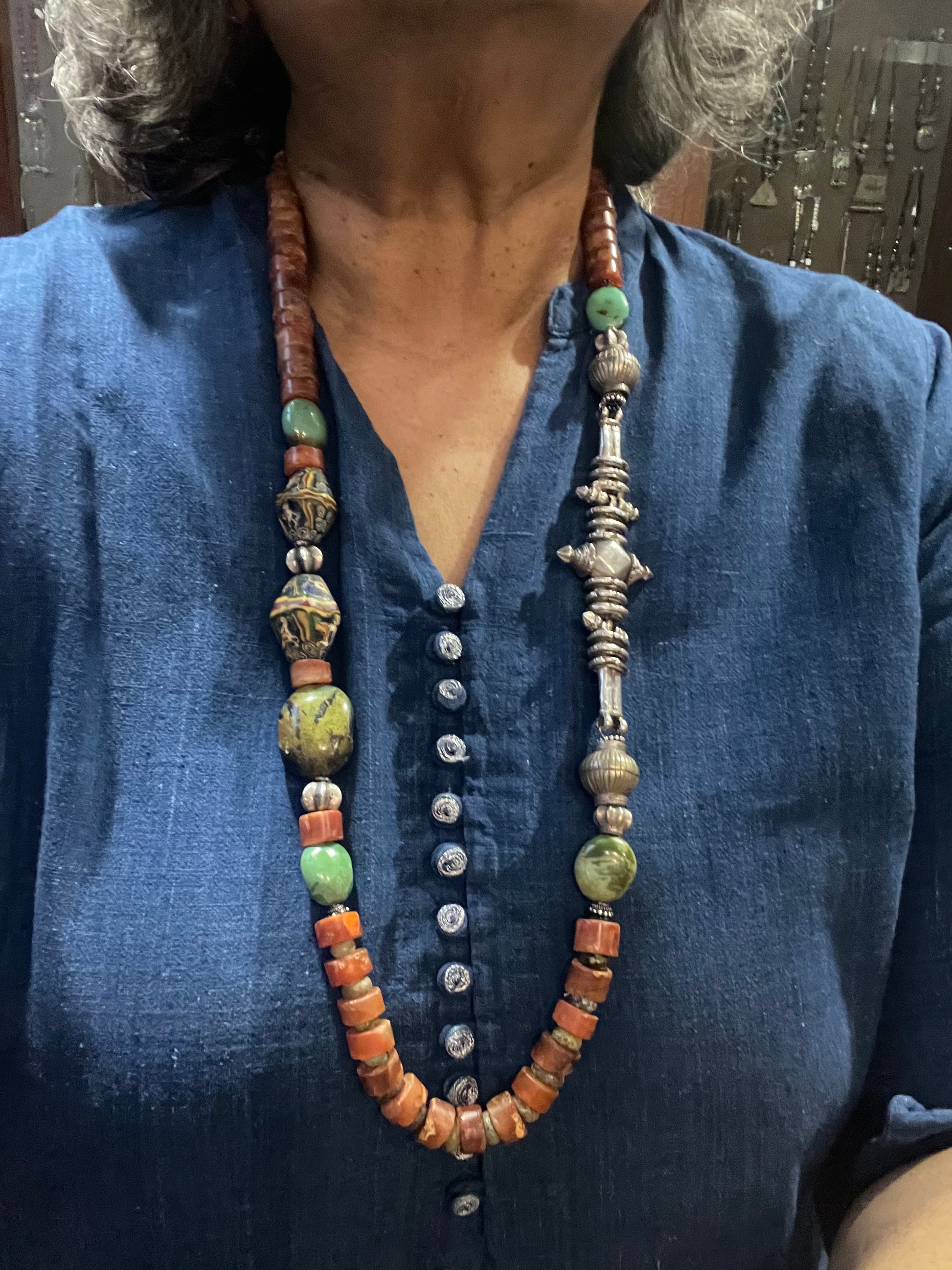 Antique silver belt buckle from South India strung with turquoise, old carnelian, old silver and antique Jatim glass beads from Java Indonesia