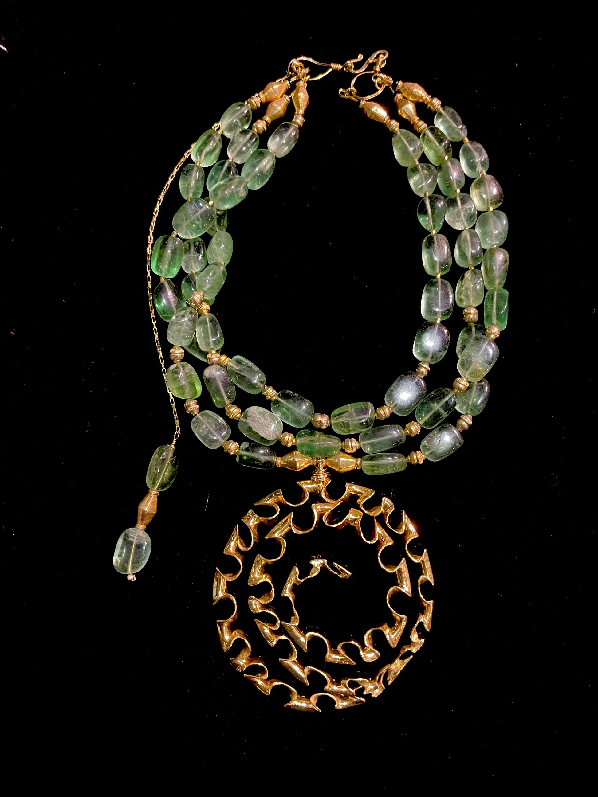 Silver gold plated wire pendant with green fluorite and old silver gold washed beads.