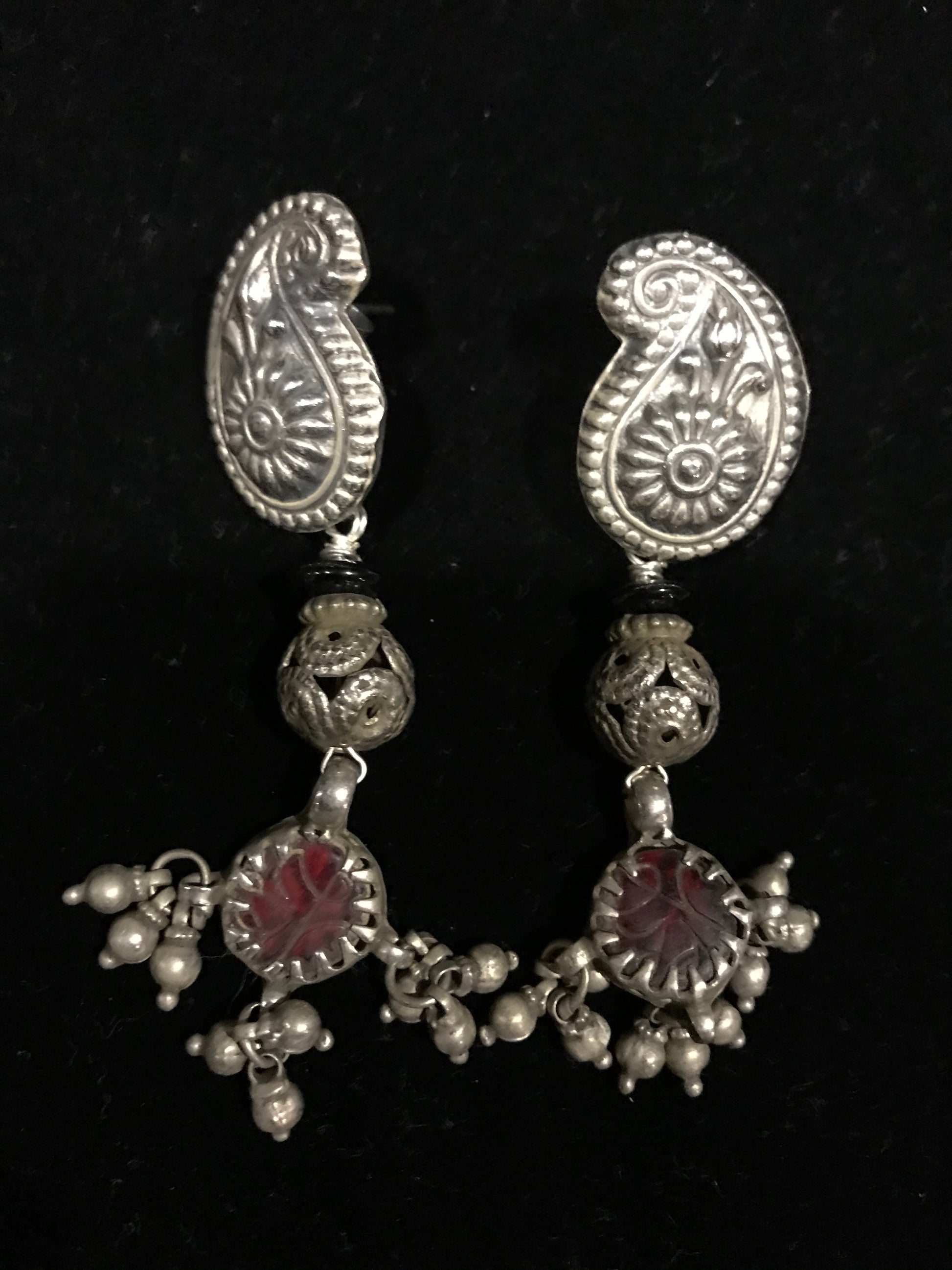 Antique silver Paisley ear studs with old red glass afghan drop pendants and afghan silver beads