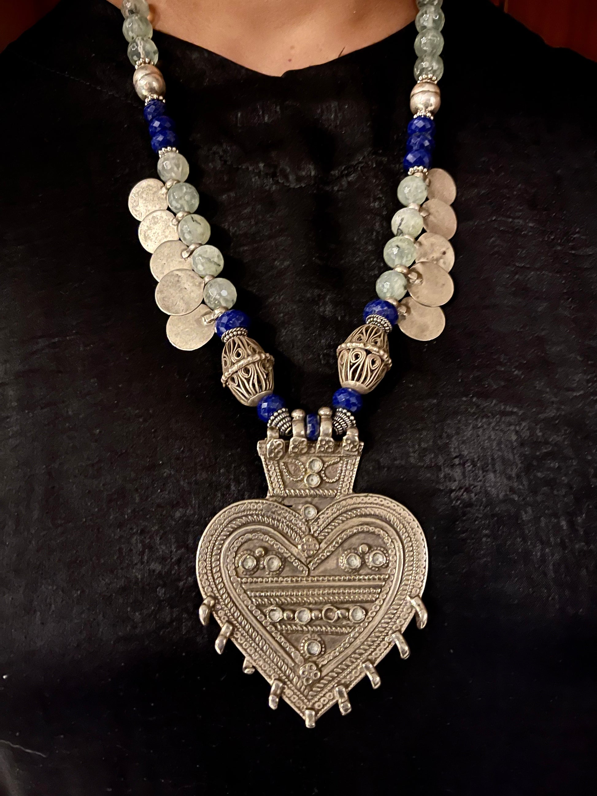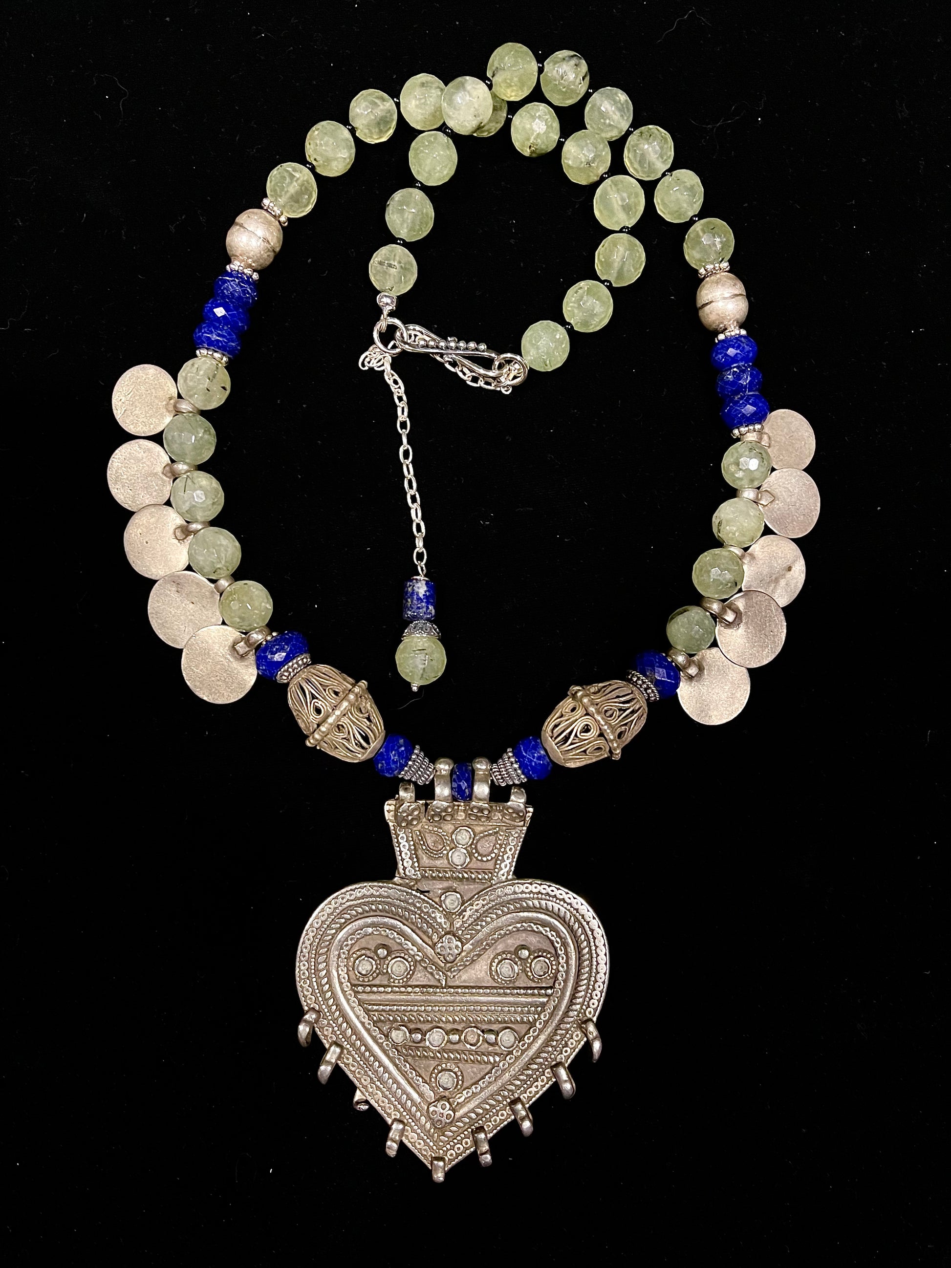 Antique Indian Silver pendant and coin pendants with prehenite and faceted lapis lazuli