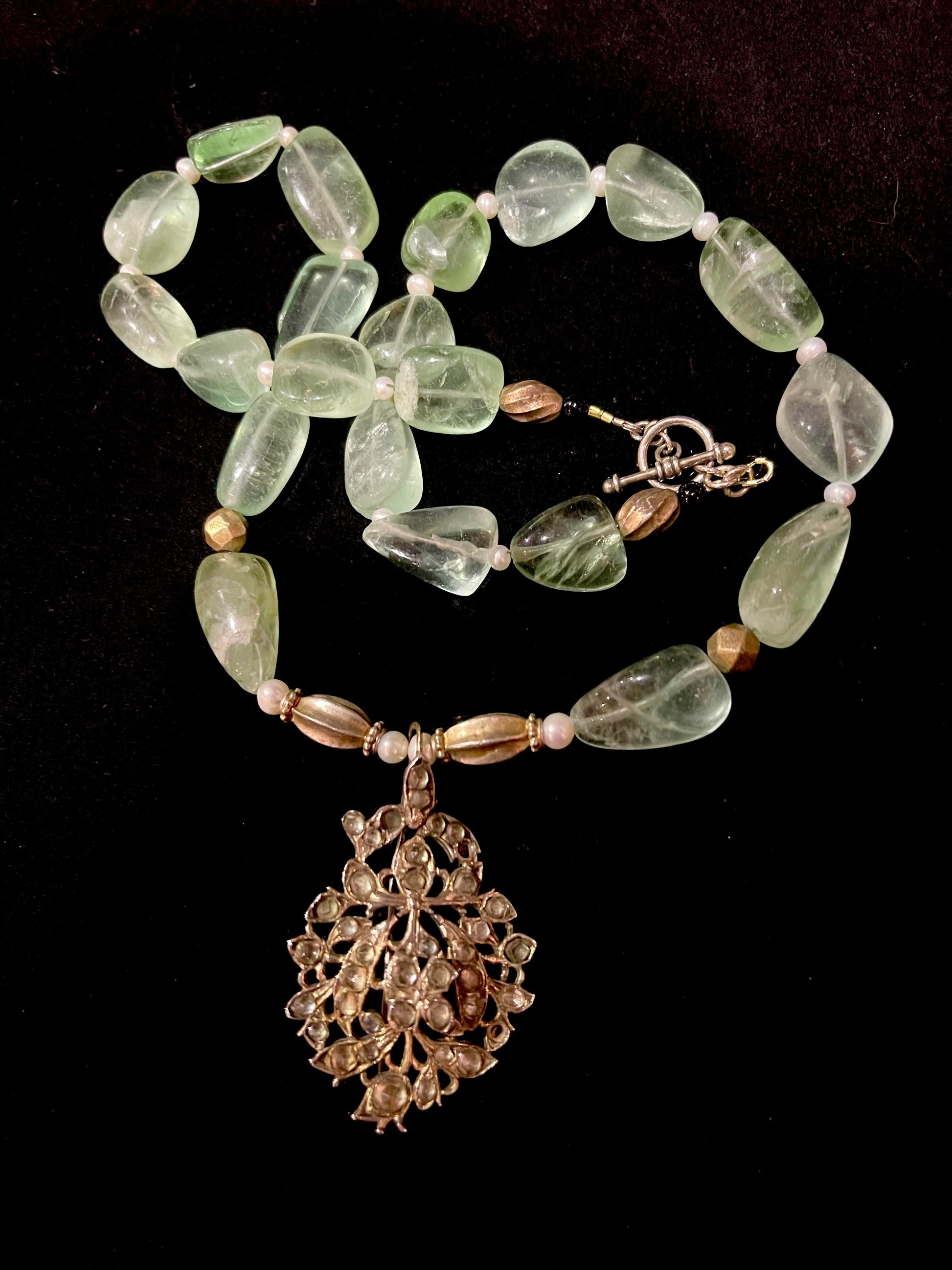 Antique silver Sri Lankan broach with matara diamonds (jargoons) strung with green fluorite and old Sri Lankan silver gold plated beads