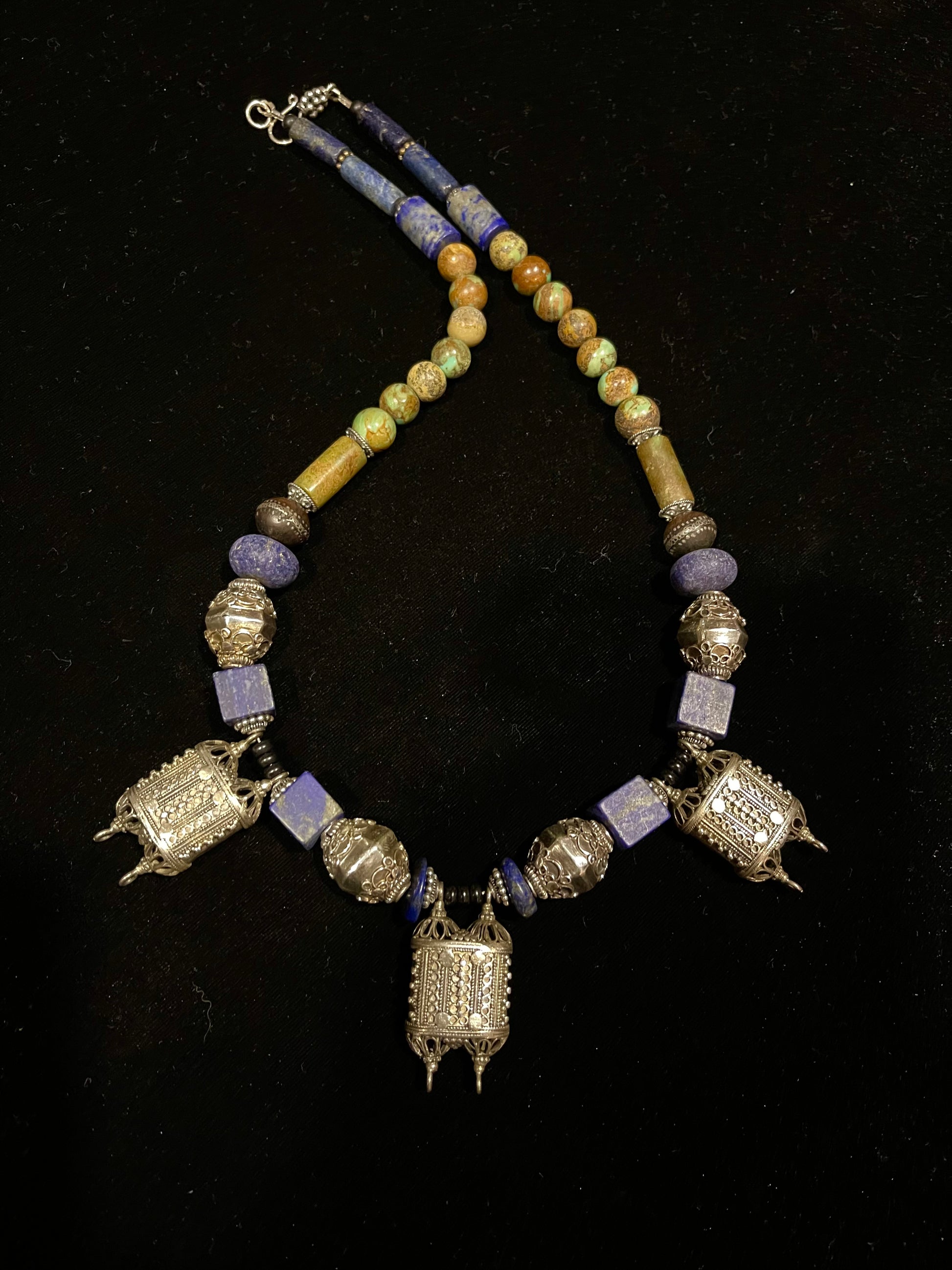 Antique silver Sri Lankan Box pendants - part of a wedding necklace from the Batticaloa region in the east. Strung with old turquoise and lapis lazuli .