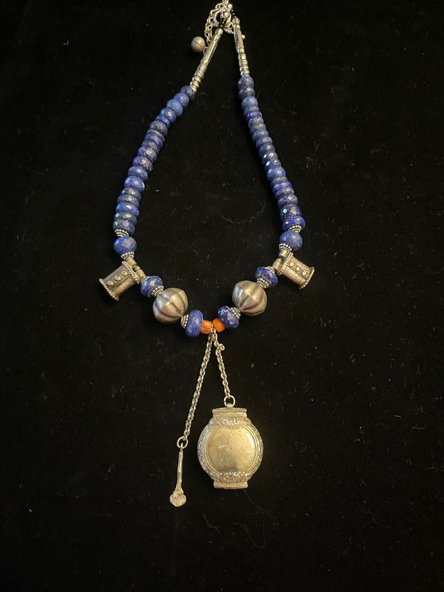 Antique Sri Lankan lime paste box and antique Sri Lankan silver beads and elements strung with lapis lazuli and coral.