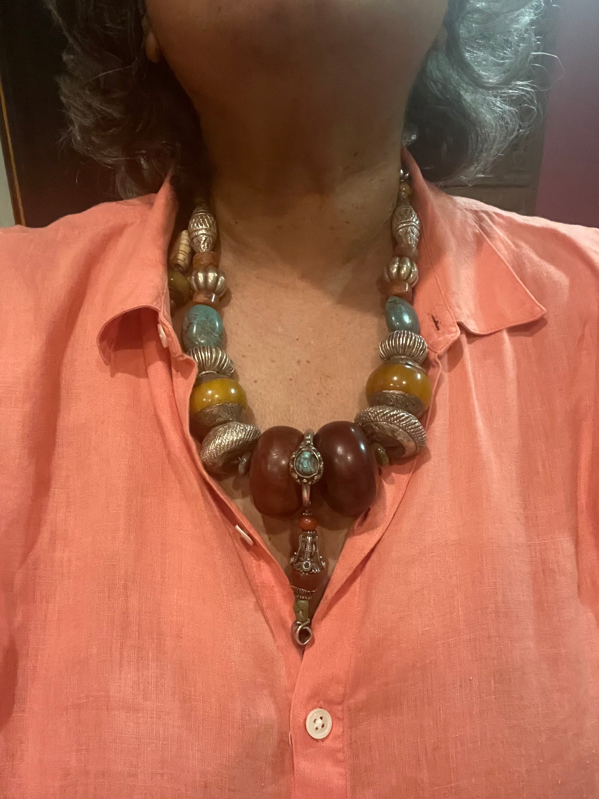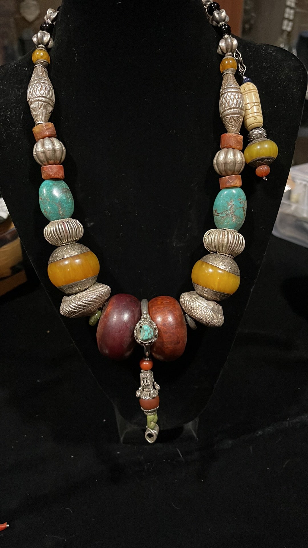Antique Tibetan earring is used here as the central pendant and held in place by 2 large old phenolic resin beads . Strung with old Tilhari Tibetan silver beads, Tibetan amber beads, old carnelian, turquoise and old silver