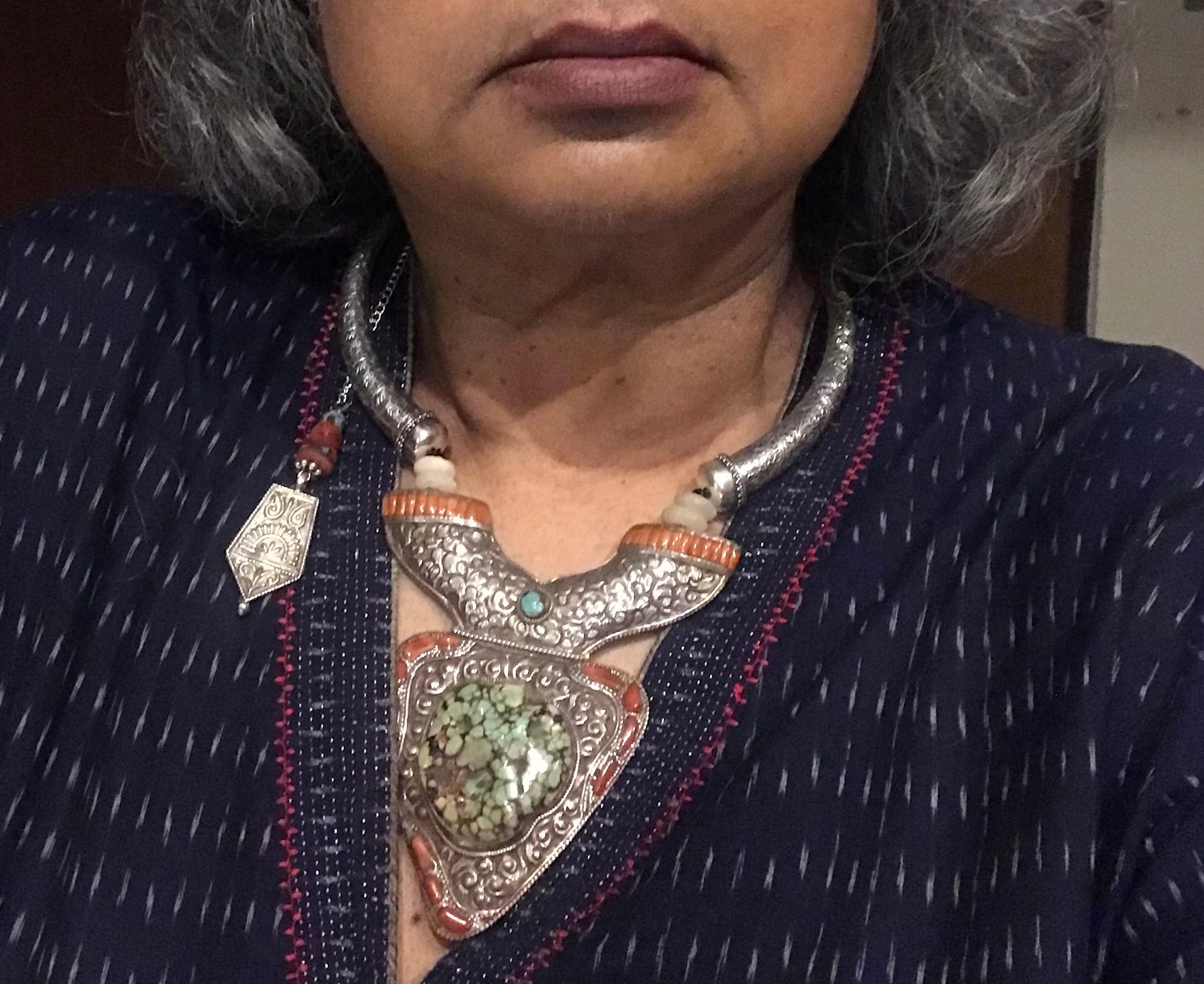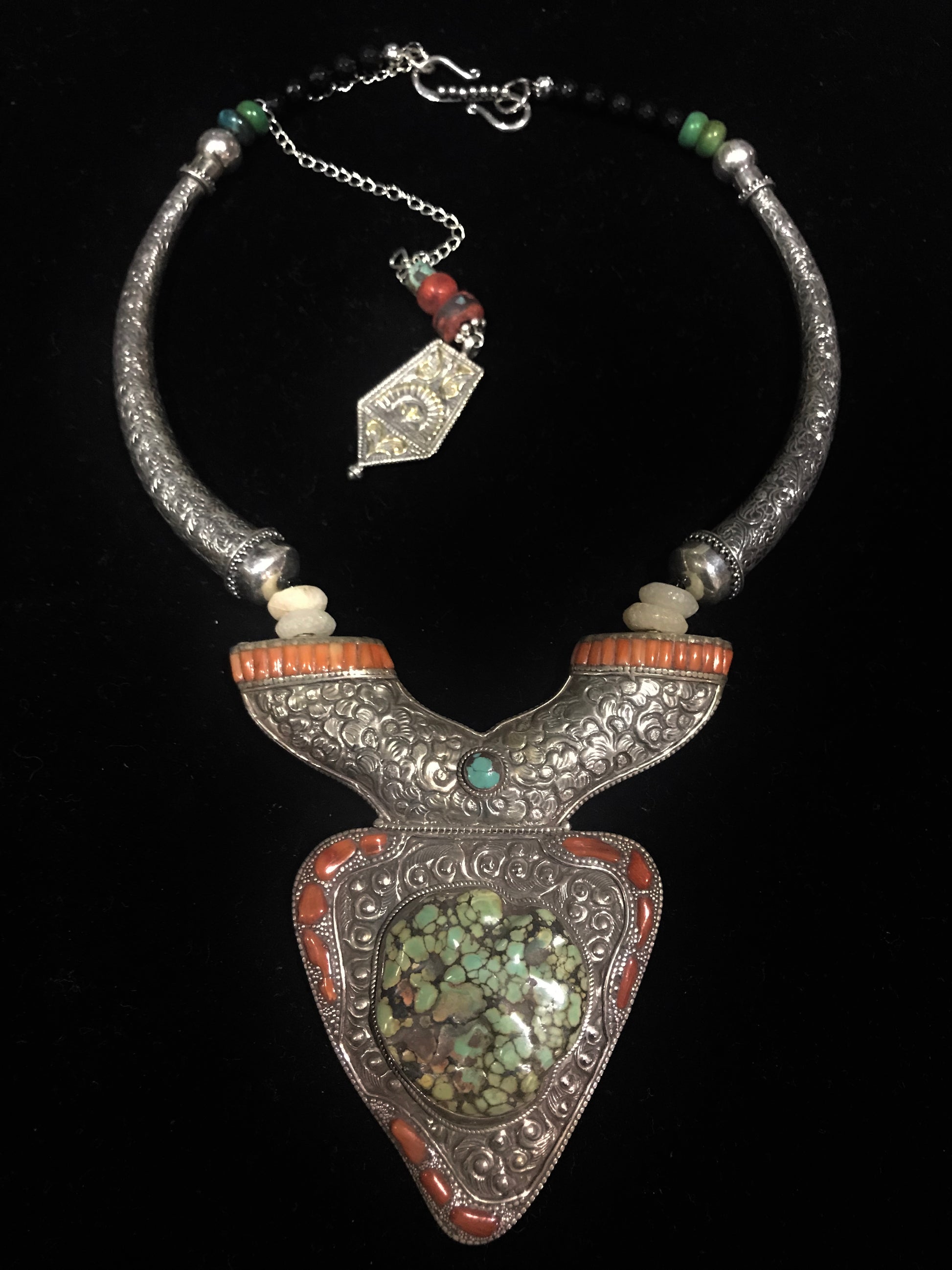 A large Antique silver Tibetan pendant with turquoise and coral, strung silver tubes with old agates