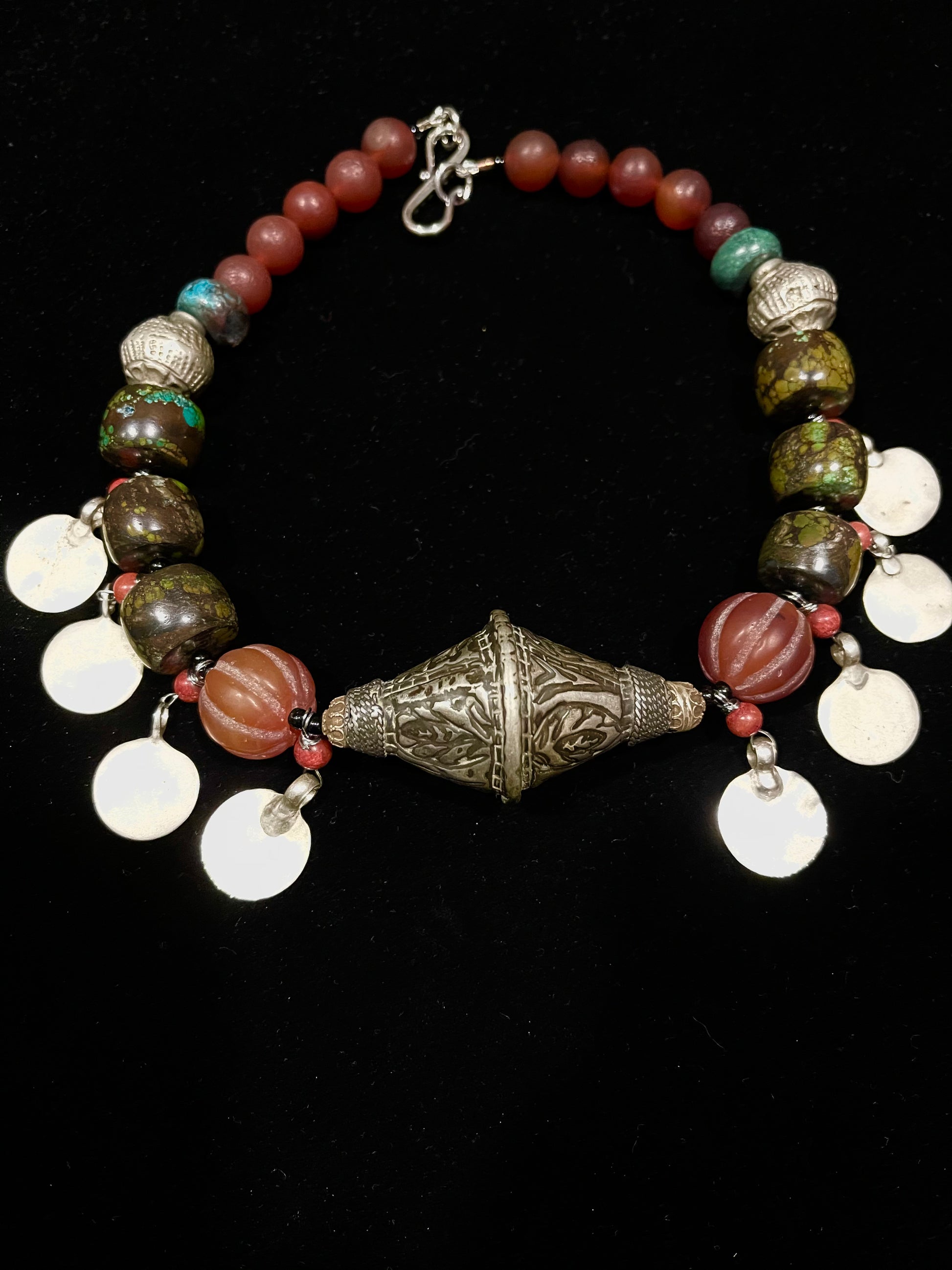 The central bead is a Baluchi ( Baluchistan) silver bicone bead- strung with old carnelian, Himalayan turquoise, silver coins and beads
