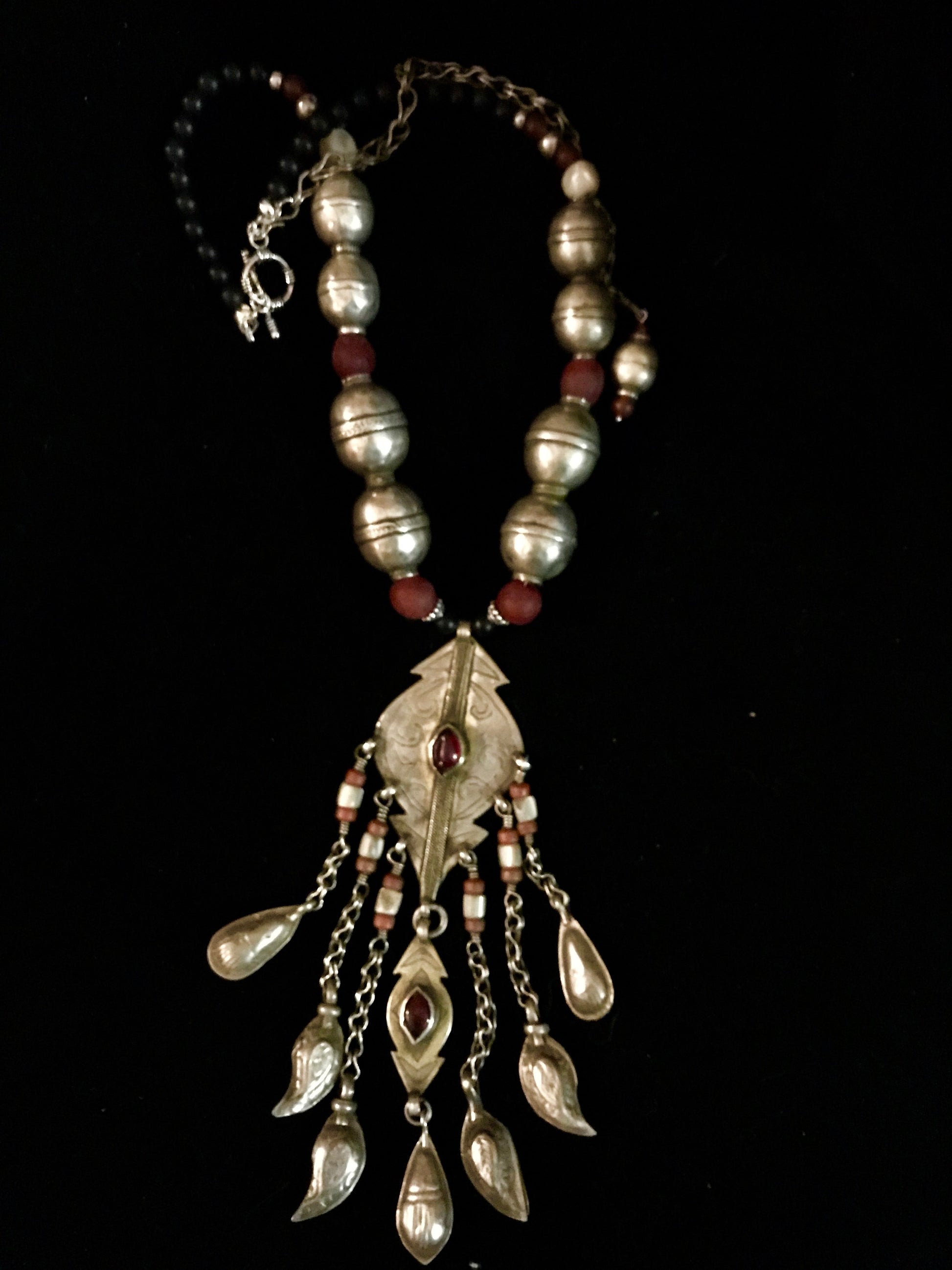 Turkoman Tekke gilded silver pendant, strung with Turkoman silver beads and carnelian.