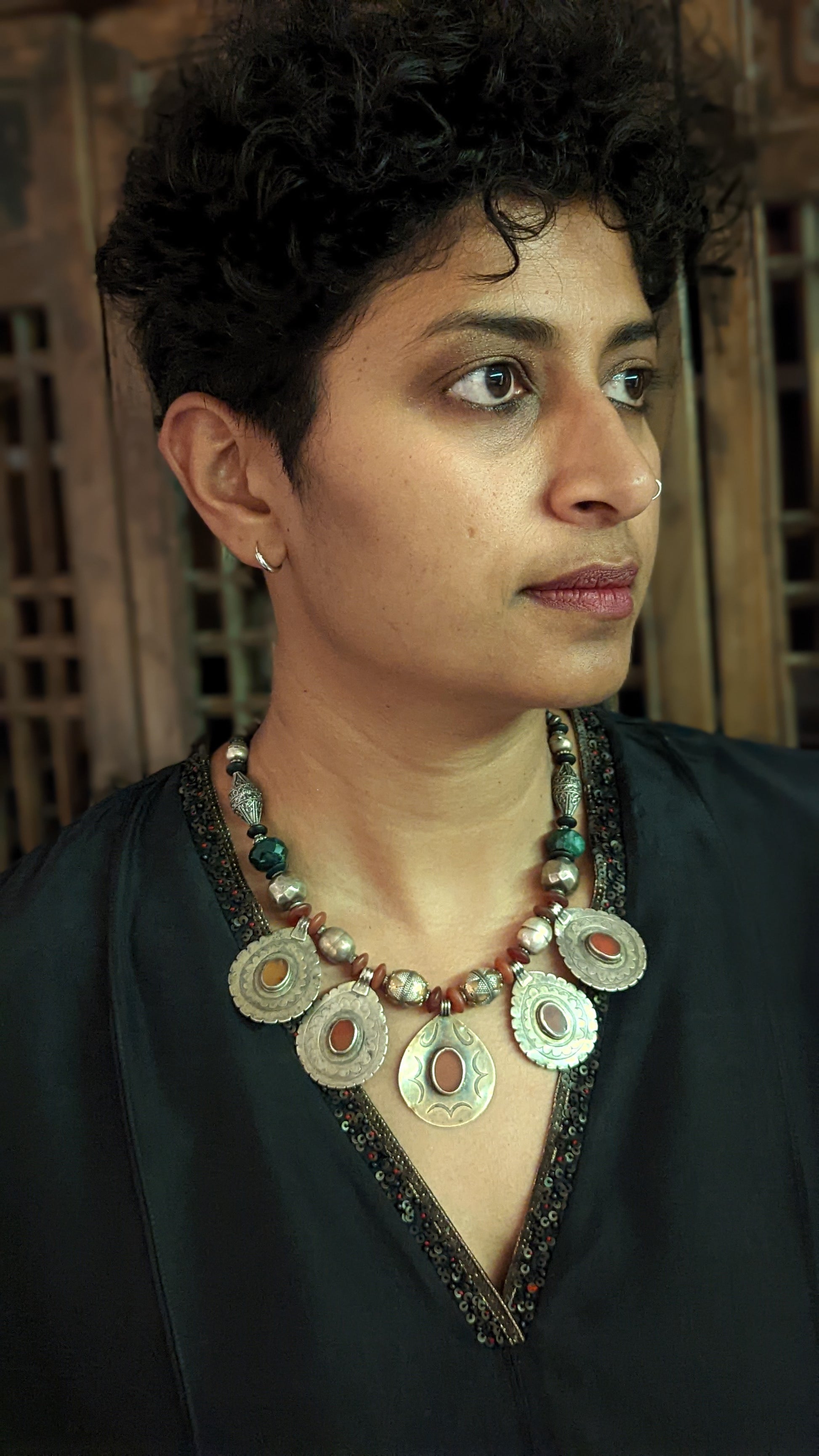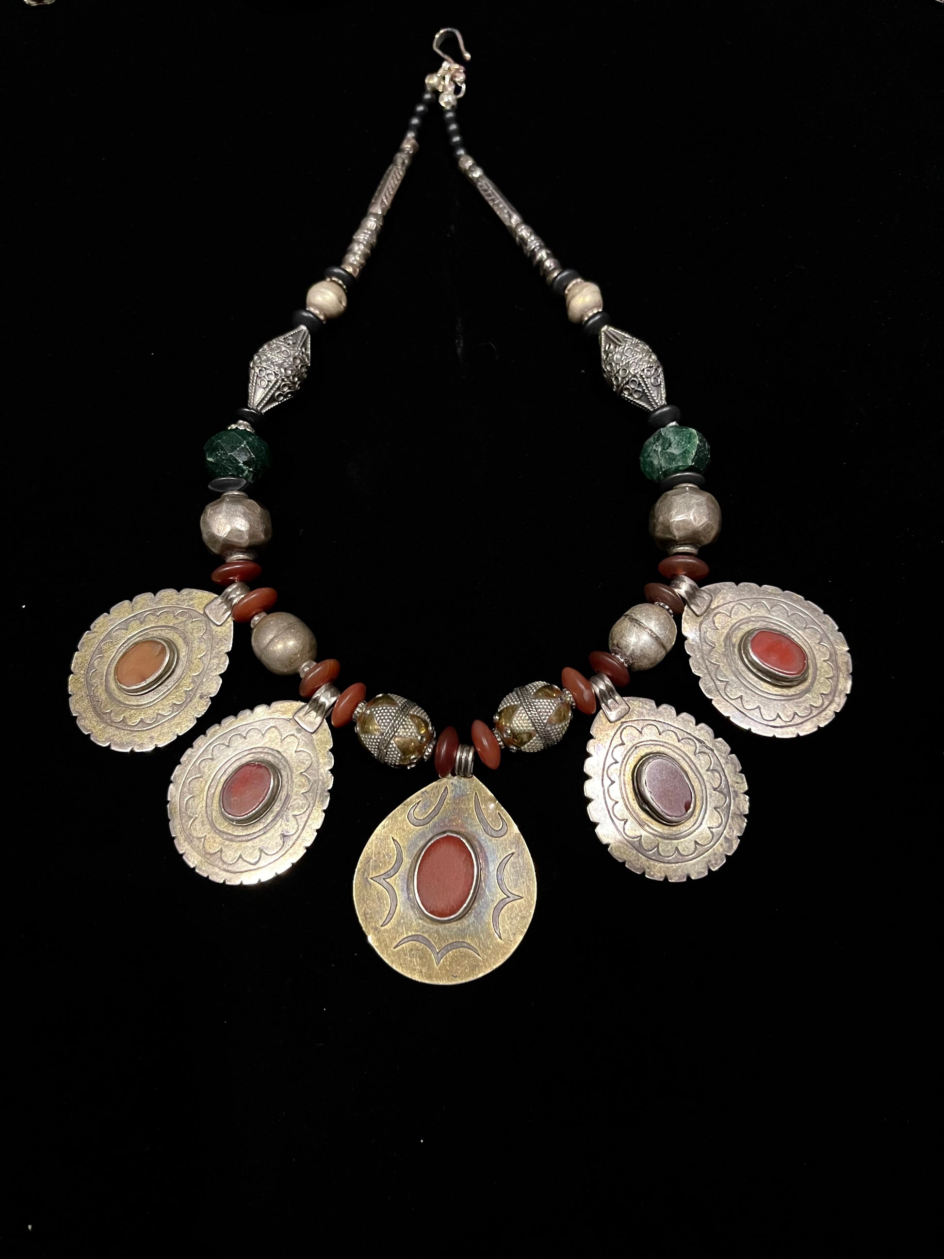 Five vintage silver and gilt Tekke Turkoman silver pendants with Carnelian insets -strung with old silver turkoman beads, carnelian and green agates