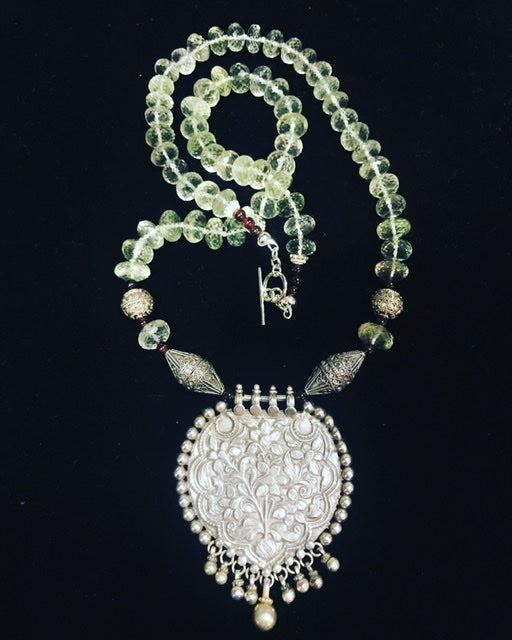 Silver pendant from India with silver beads and faceted green amethyst beads.