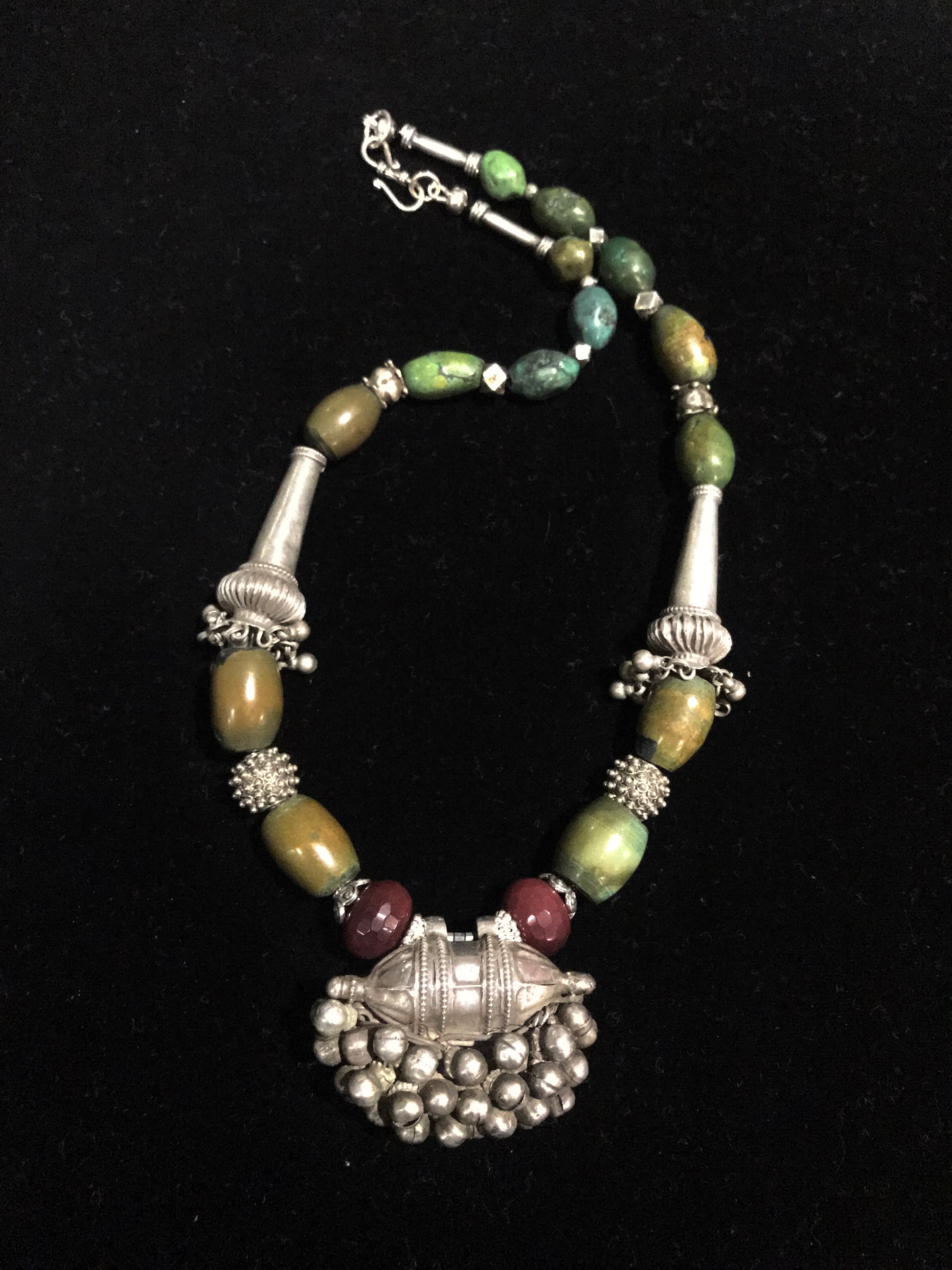 Antique silver amulet and tubes from India strung with old turquoise.