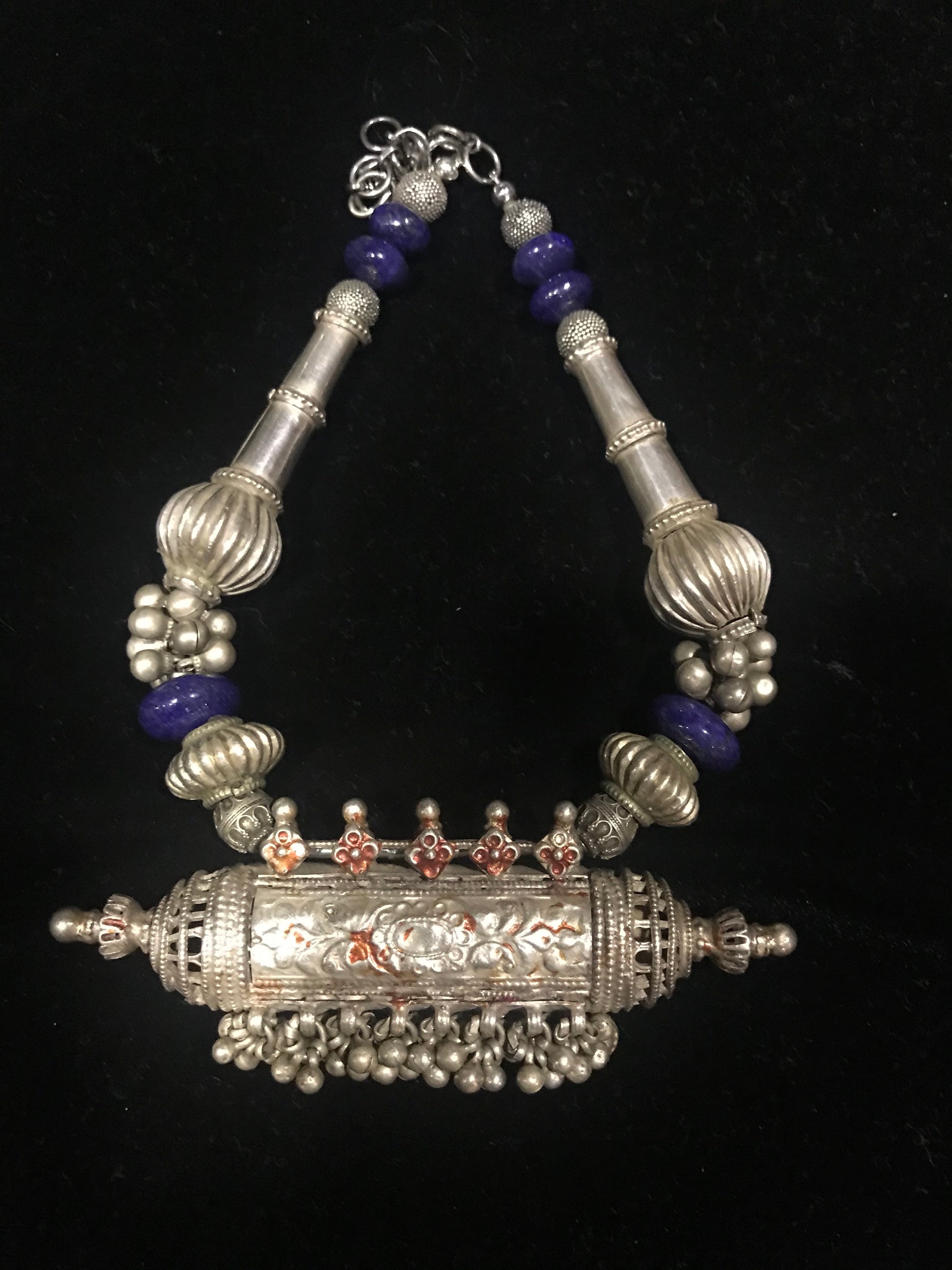A beautiful Antique silver Amulet from Gujarat- this amulet can be worn both ways . Strung with old silver and Lapis Lazuli.