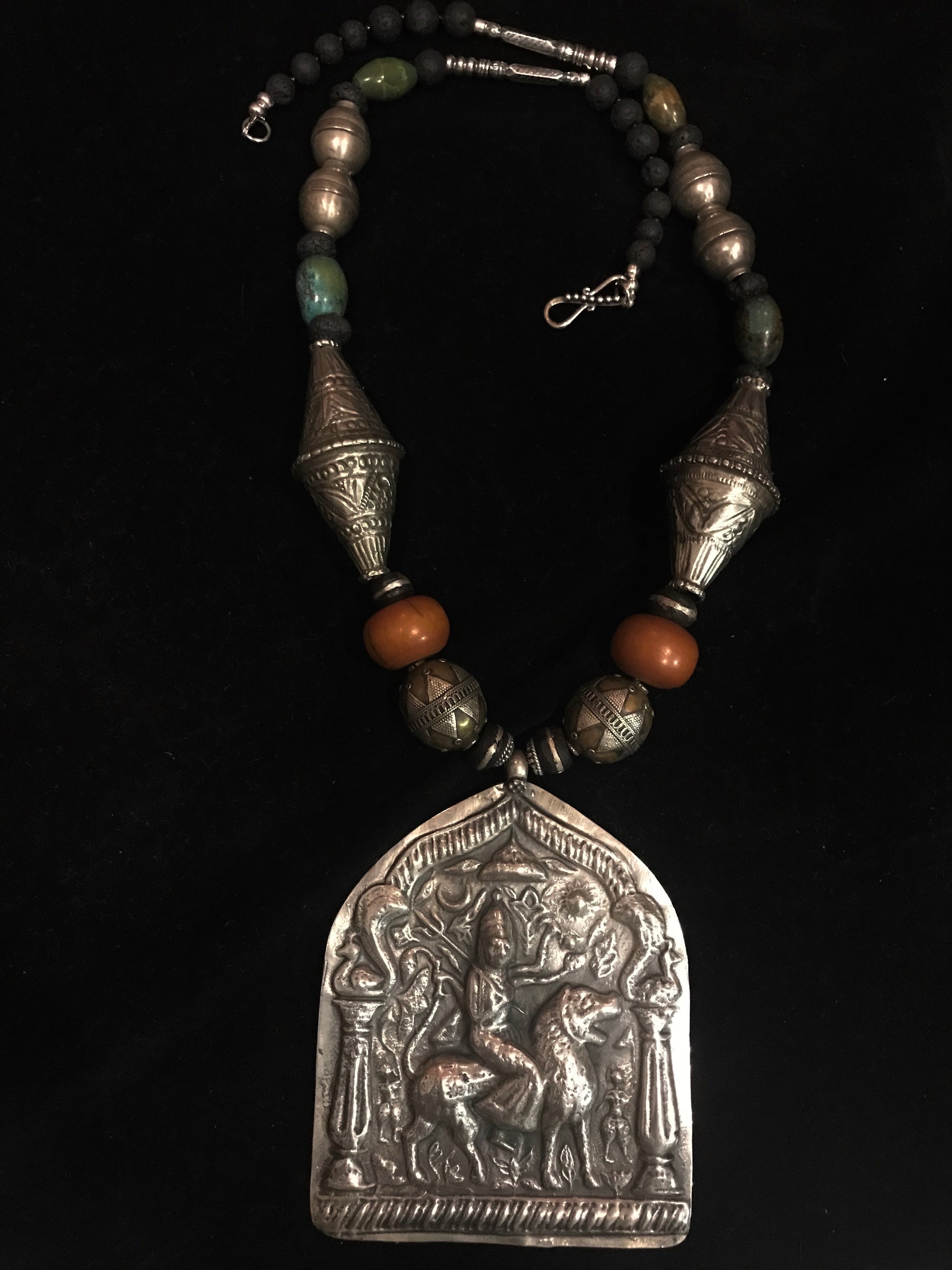 Strung with old Baluchi bicone silver beads, Turkoman silver beads, phenolic resin beads and turquoise.