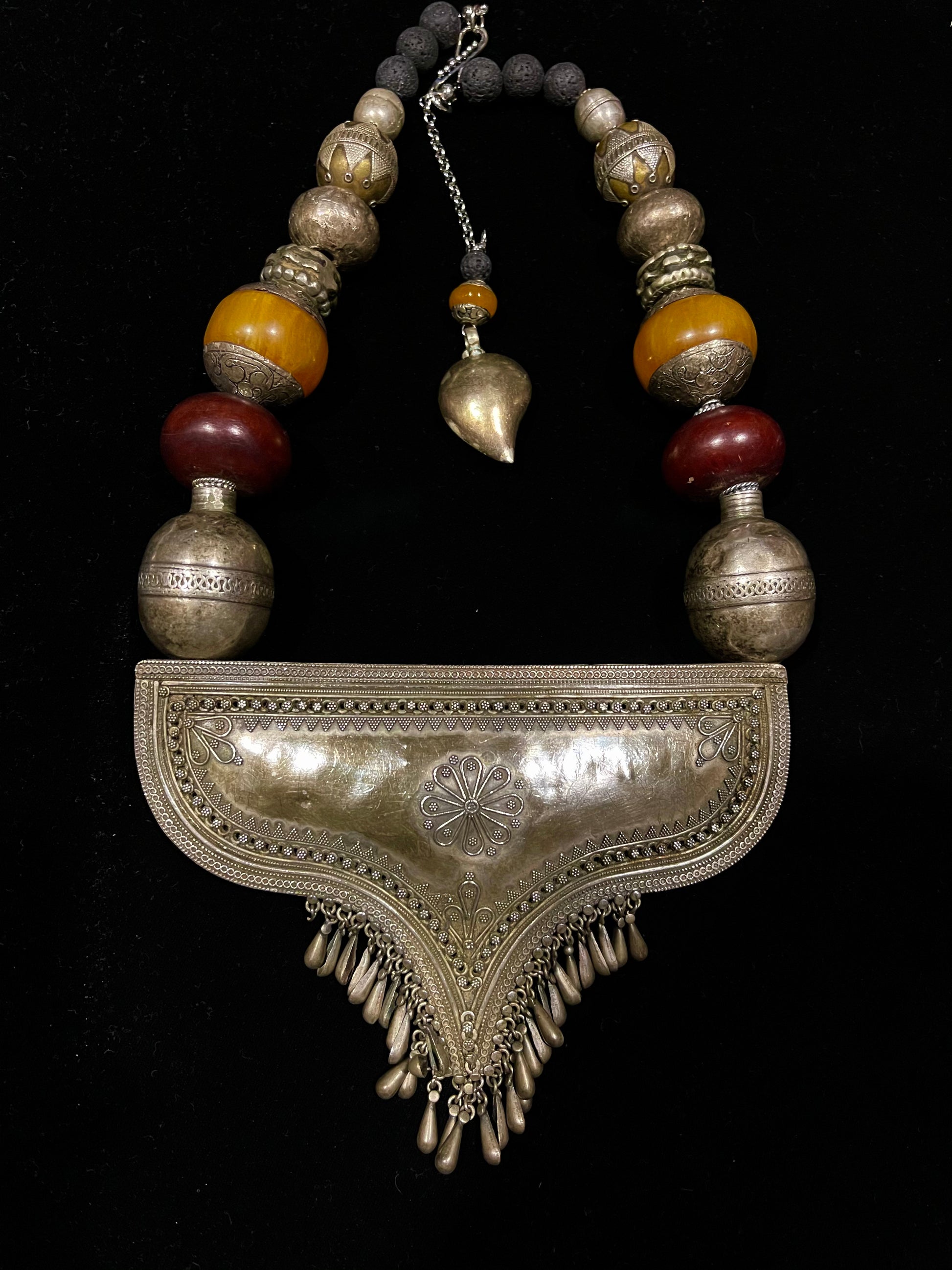 Classic silver pendant with Turkmen silver beads and phenolic resin beads