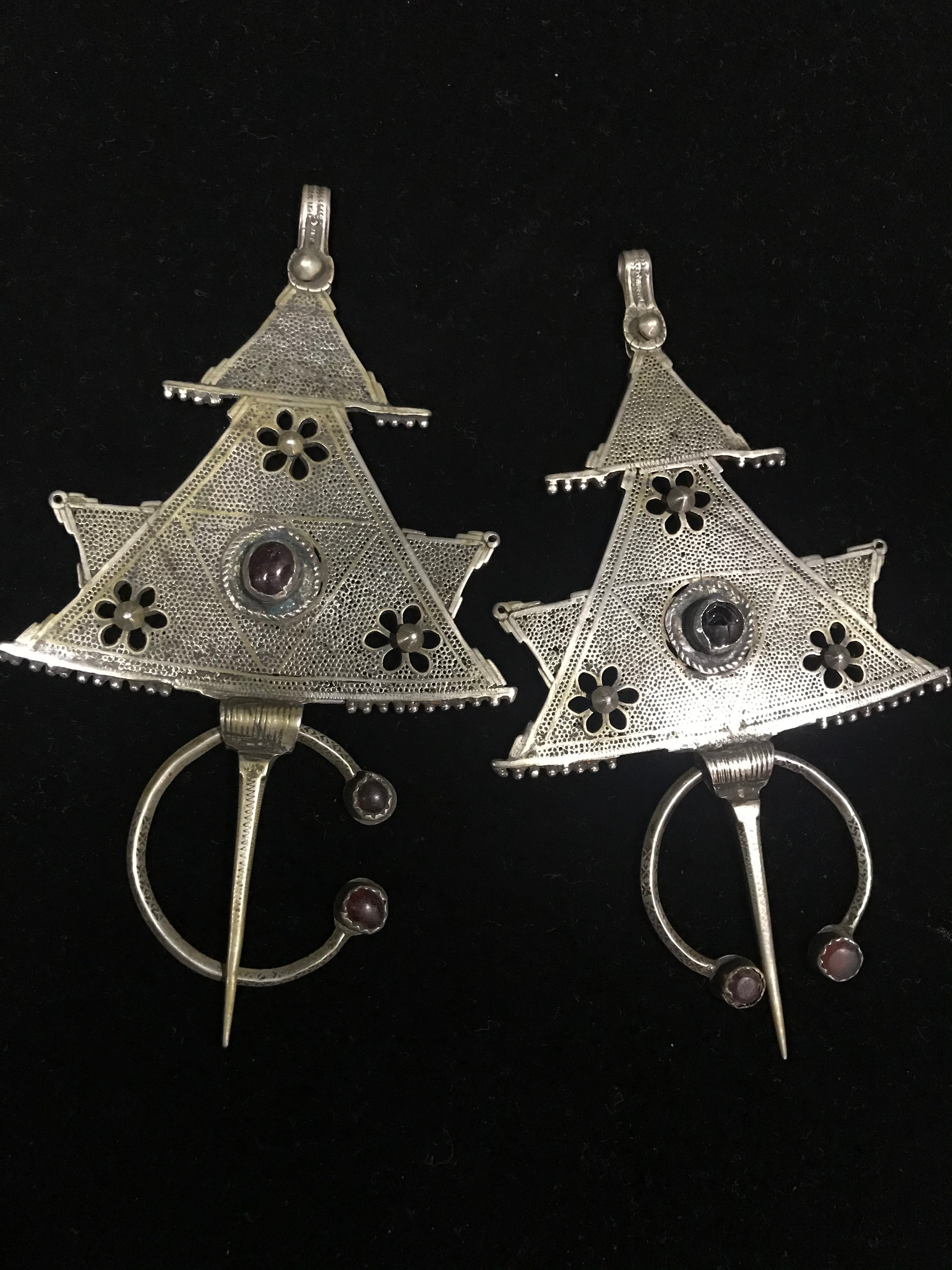 A very Rare pair of ‘wormhole’ fibulae with old red glass- early examples from the Ait Ouarzguit area of Morocco. This pair is in very good condition with some slight ‘wear’ at the back of one ( see photo)
