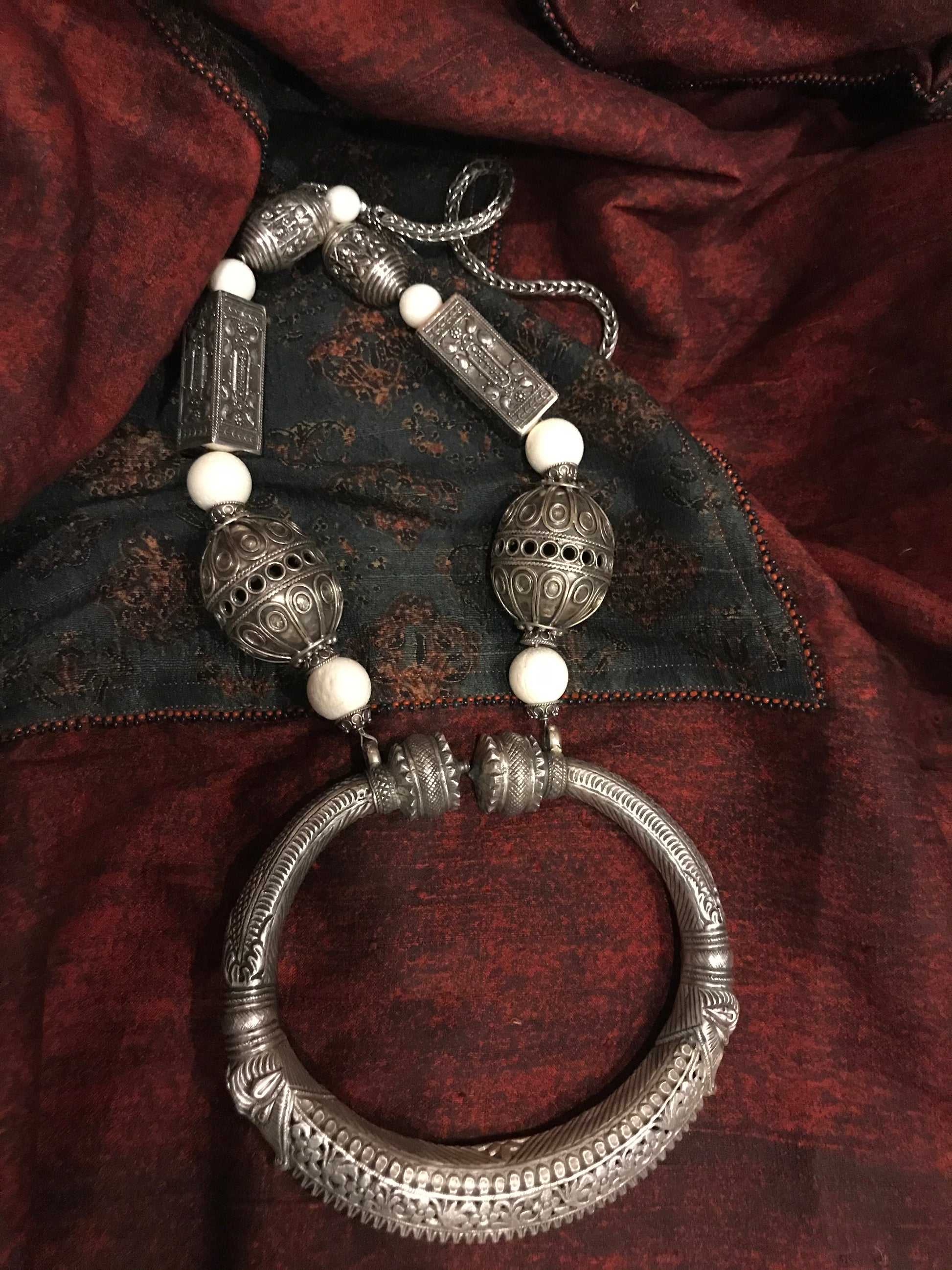 The Pendant on this necklace is an antique silver dancers anklet. The bangle is filled with seeds that make a soft rustling sound when the dancer moves.