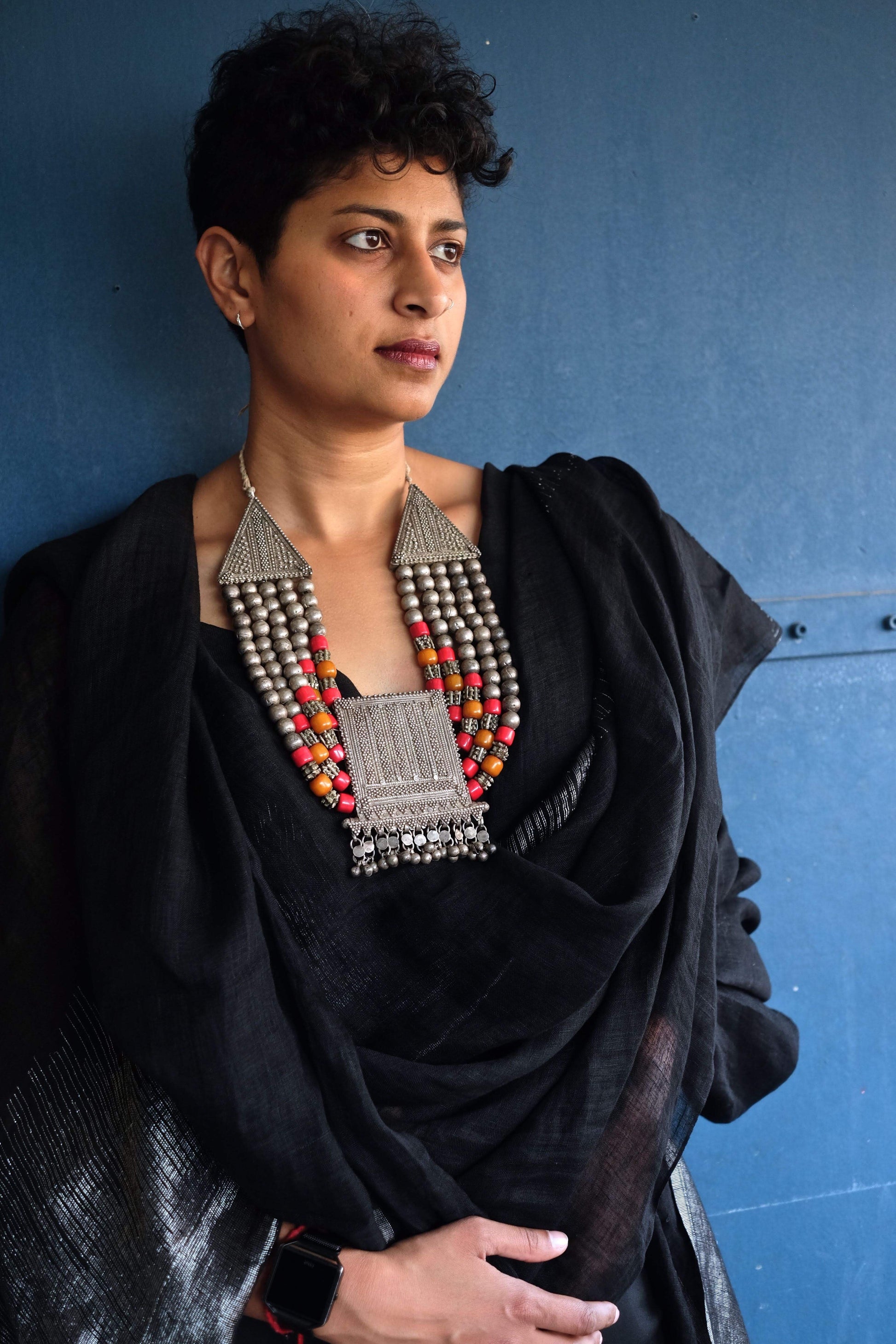 the plain silver beads are typical of these necklaces, corals are sometimes used with the silver, but in this case we see old glass beads added for colour.