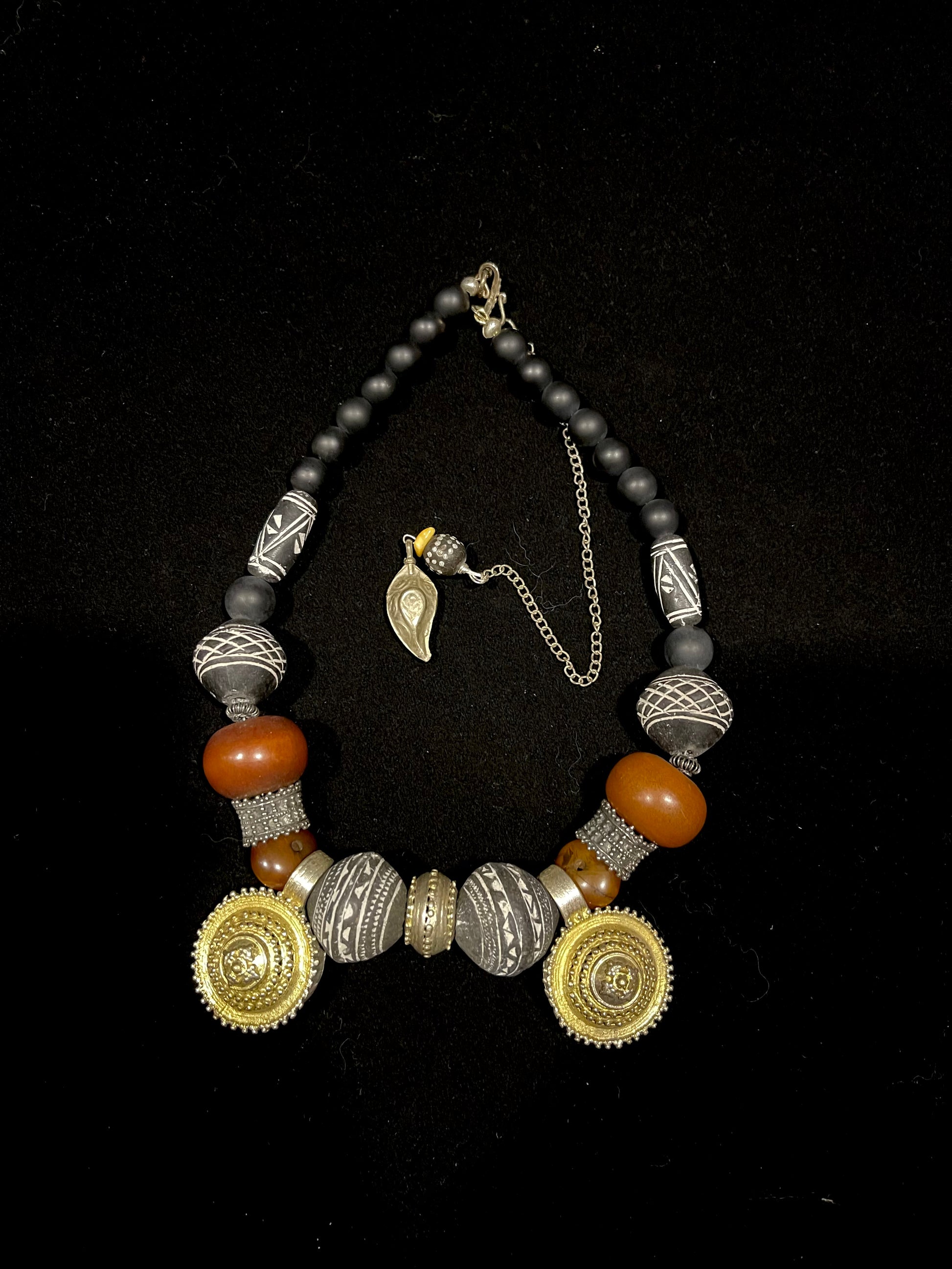 2 antique Ethiopian pendants and central bead - these are gold plated on base metal or low silver . Strung with vintage phenolic resin beads and Mali clay beads and black obsidian