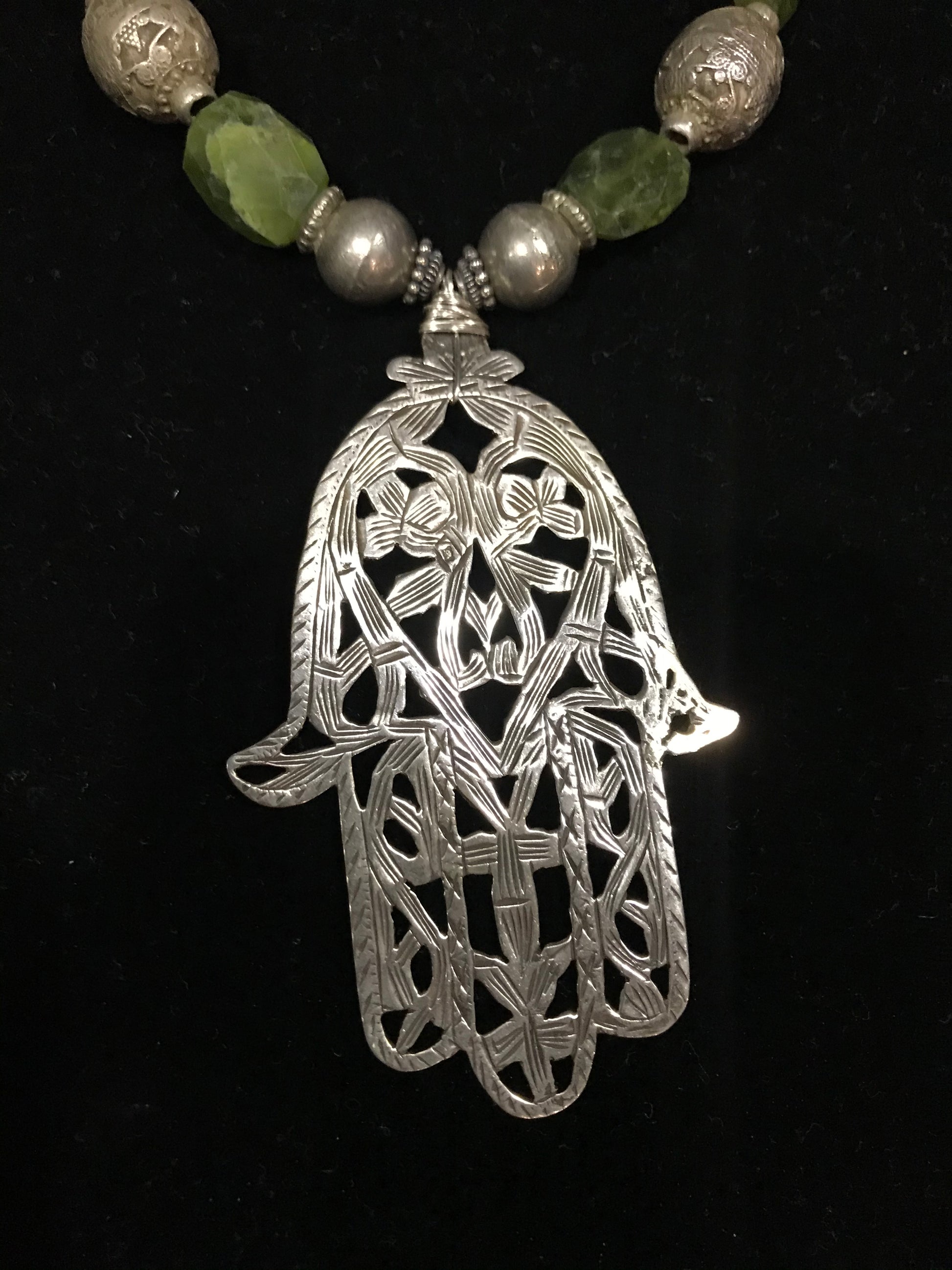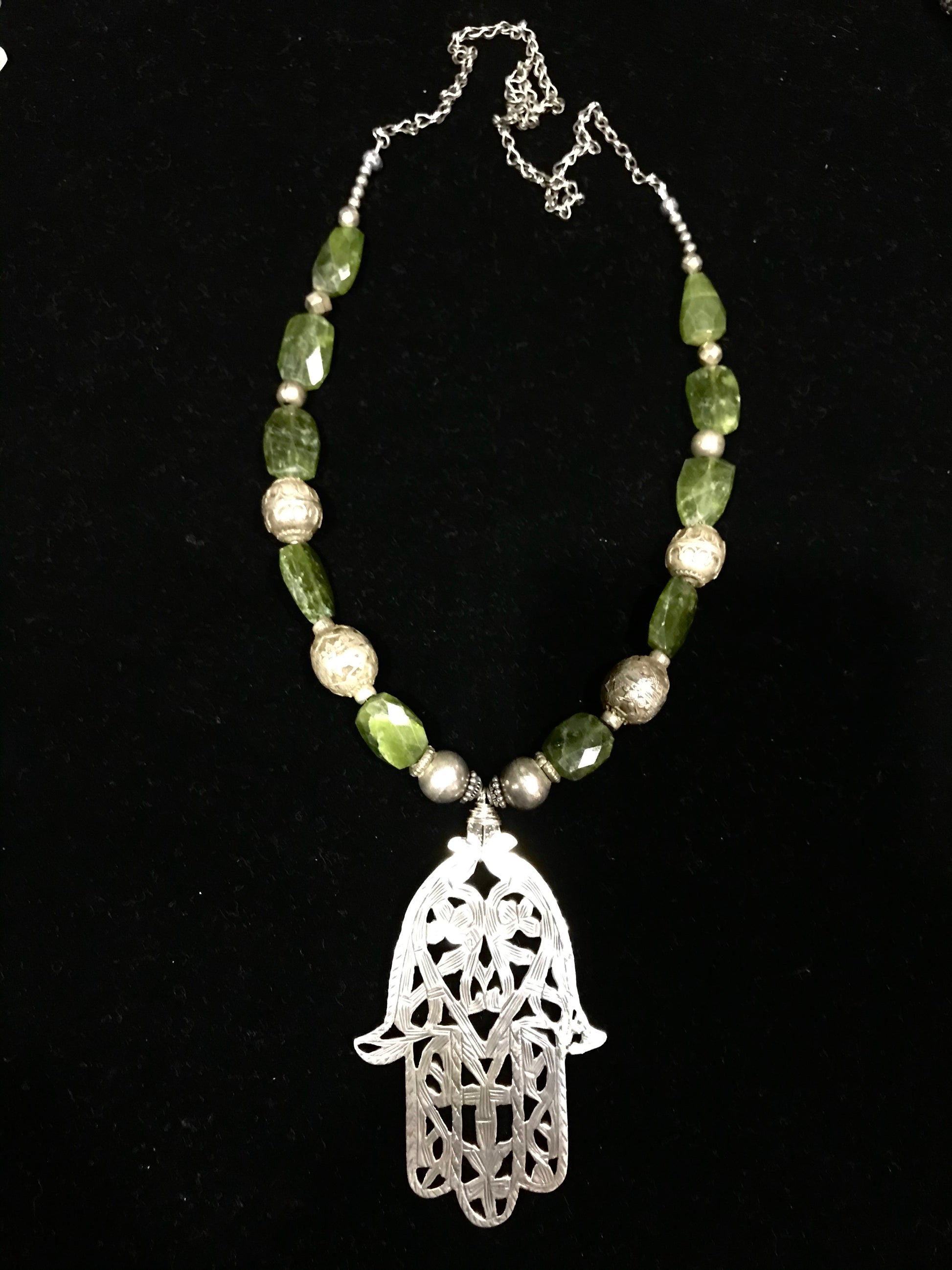 An Antique silver Khamsa with beautiful detail, strung with green garnets and silver.