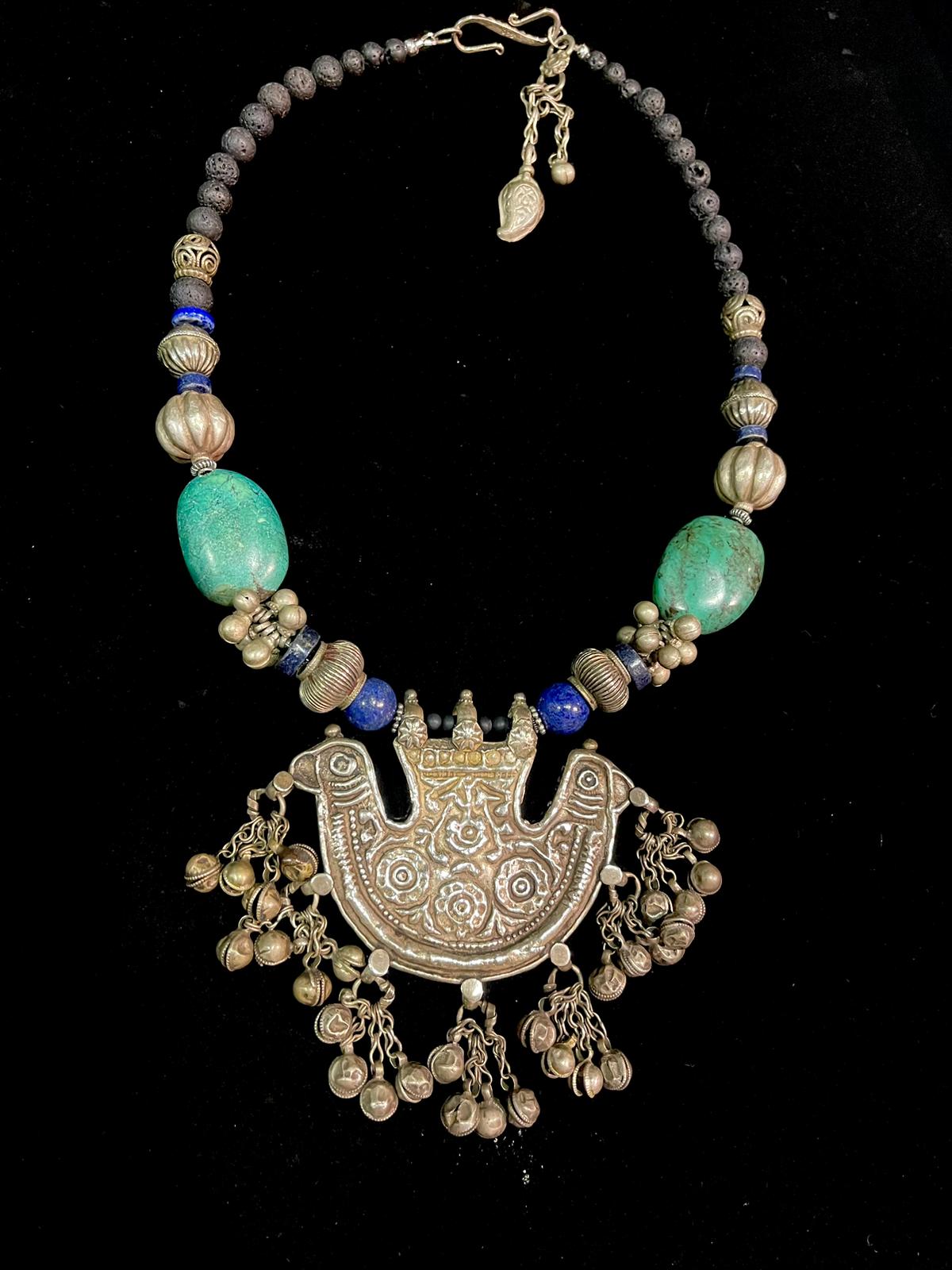 Antique Pendant with Turquoise, Lapis Lazuli, and Old Silver Necklace