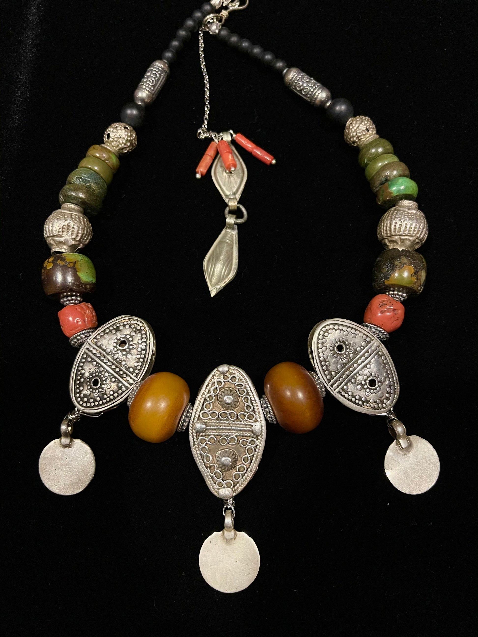 The three main oval disc pendants are vintage Silver Kazakh spacers. Strung with old phenolic resin beads, mediterranean coral, turquoise and old silver .