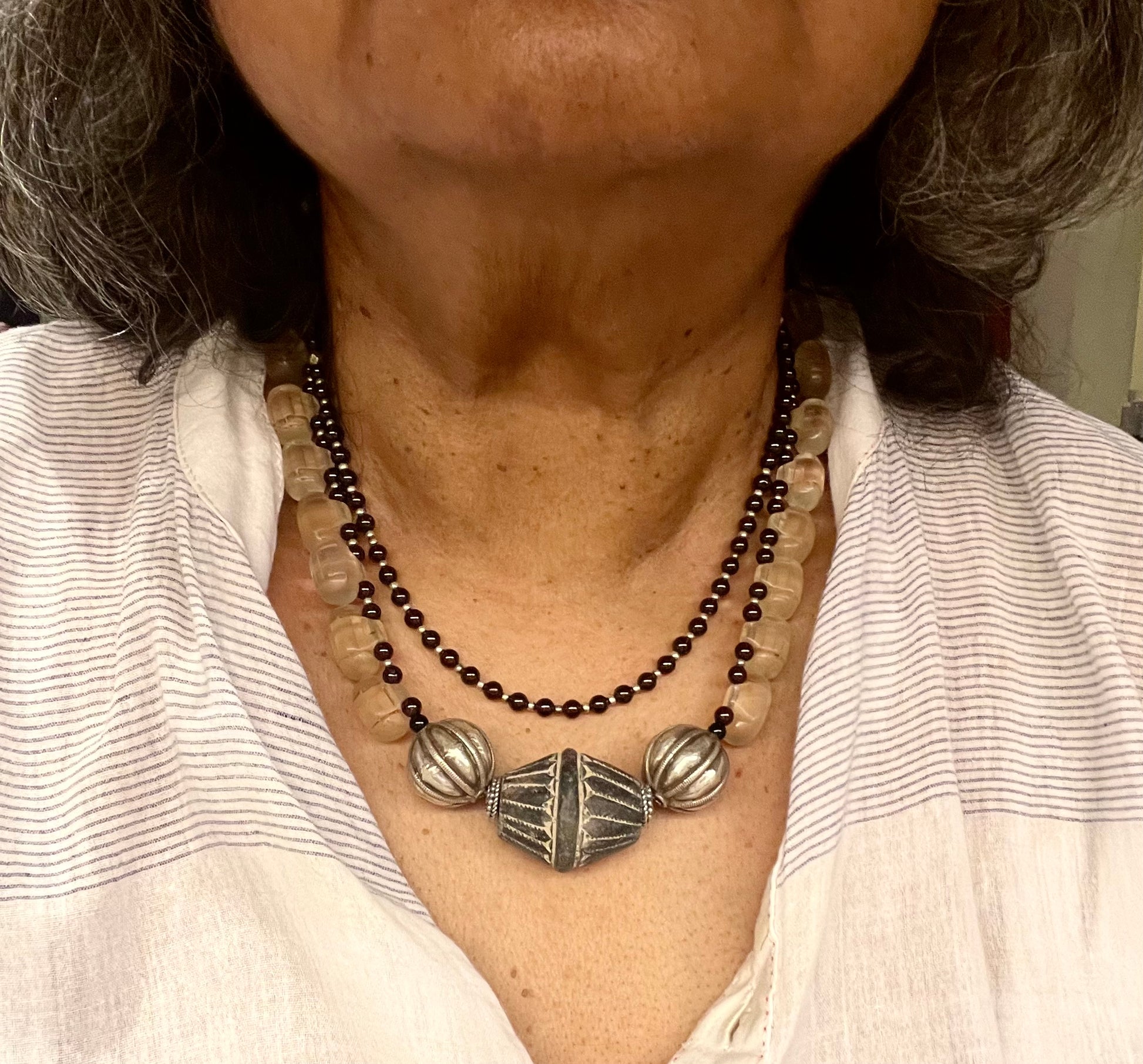 Old Mali clay bead on the centre with old silver pumpkin Indian beads, old crystal quartz and garnets