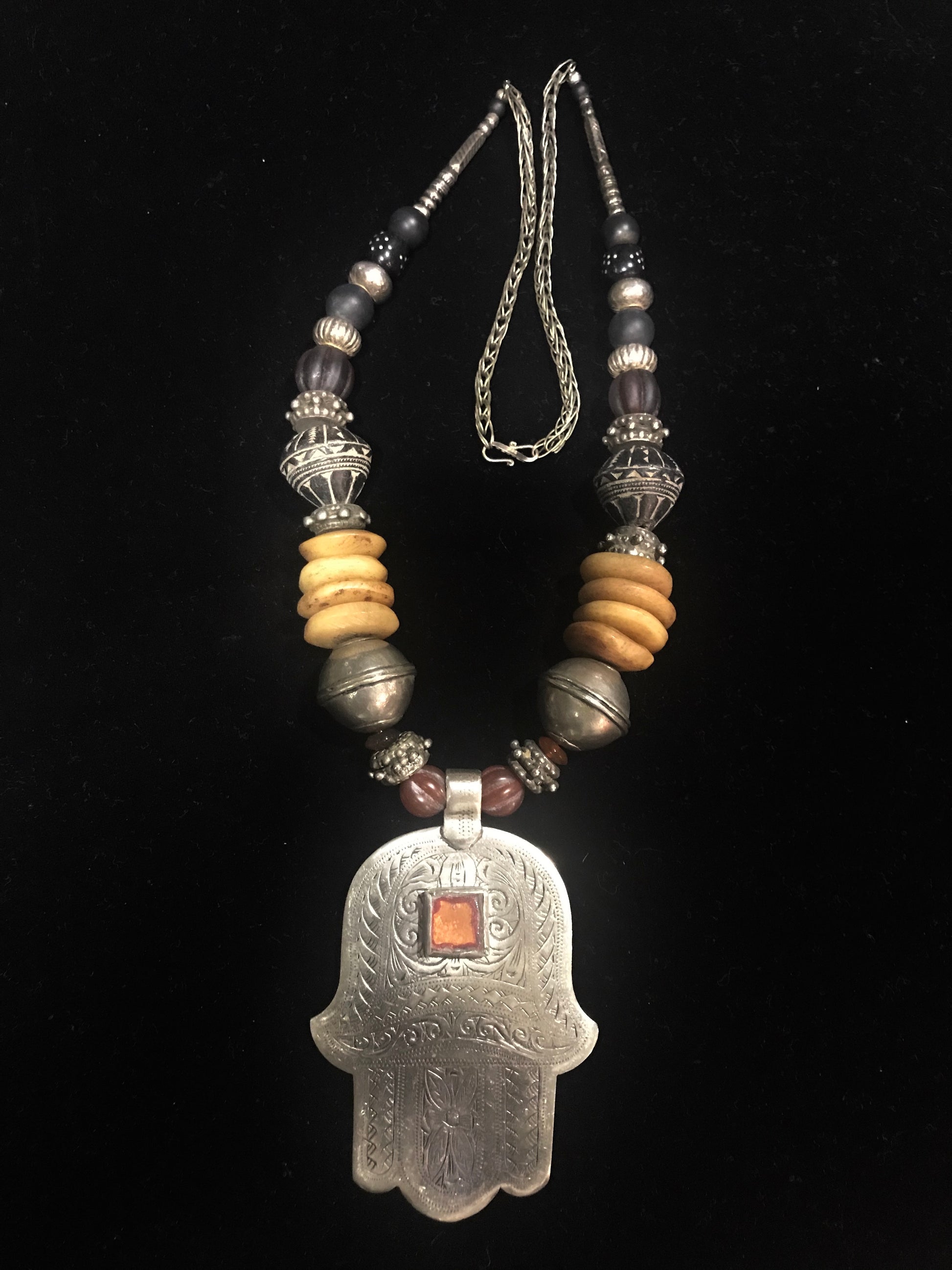 Vintage Silver Moroccan Khamsa pendant with old red glass inset.