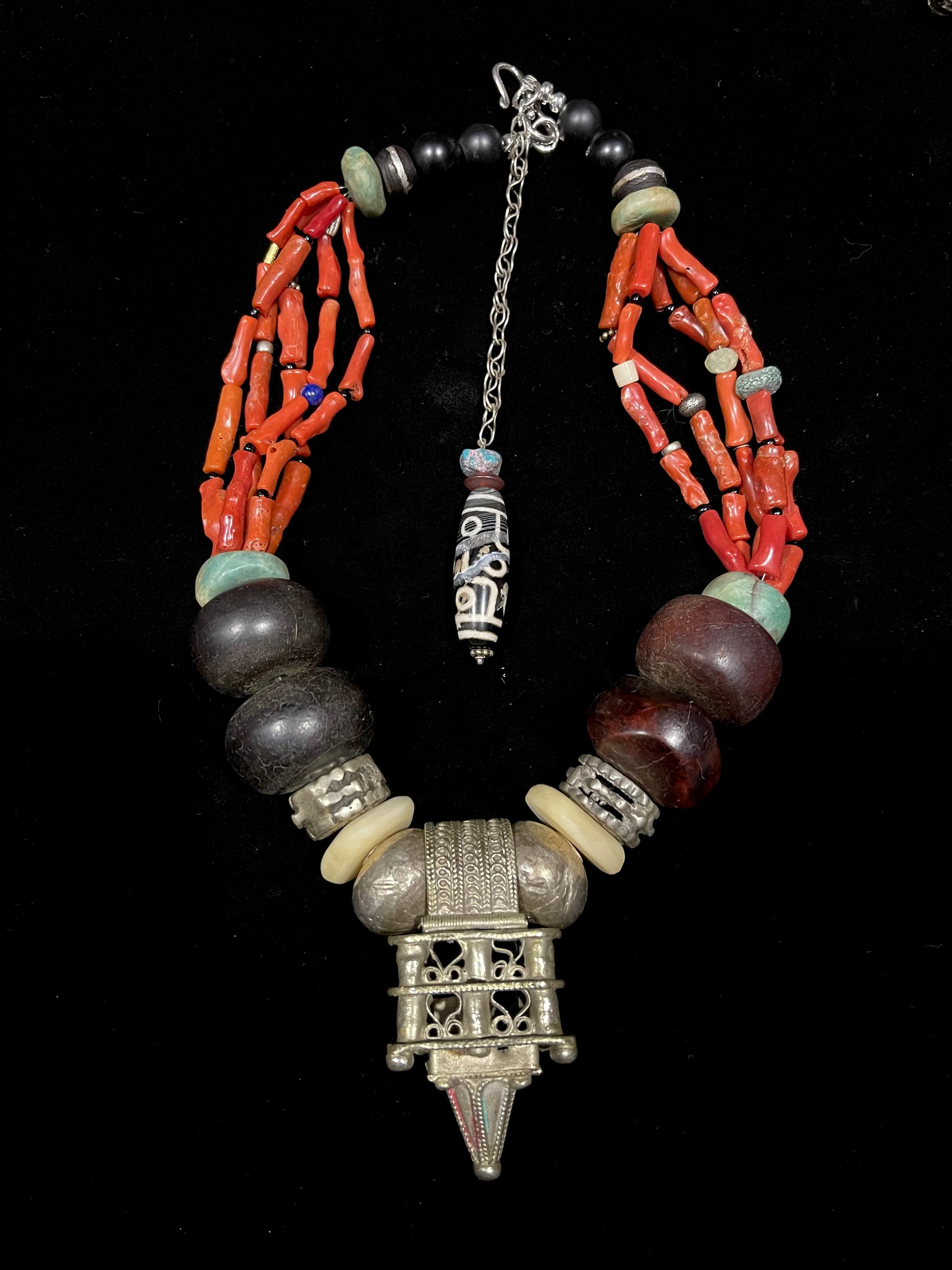 Antique silver Harratine perfume holder from Morocco - strung with phenolic resin, Mediterranean coral, Amazonite and silver.