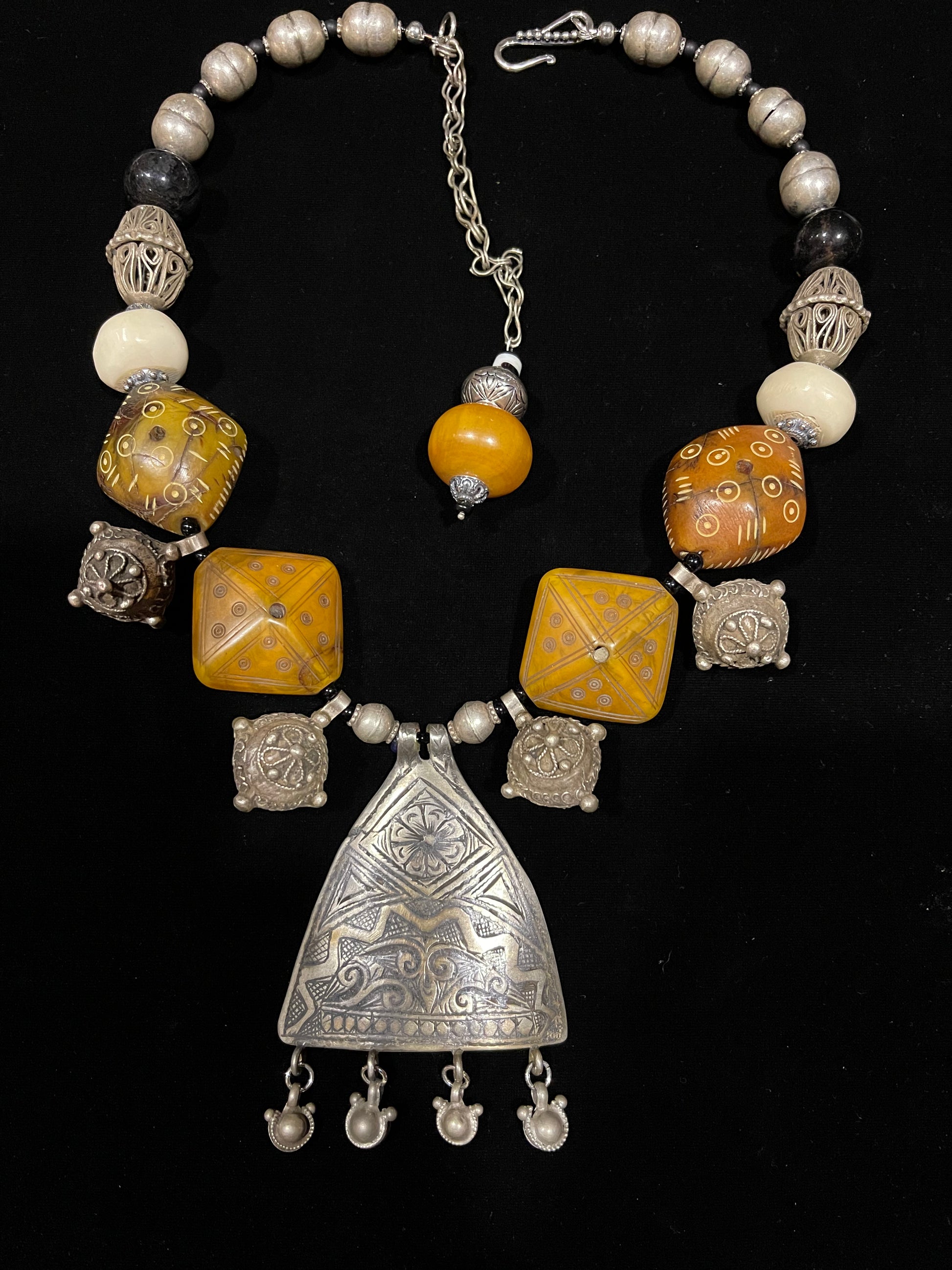 Antique Moroccan Niello pendant strung with old Moroccan beads and old Phenolic resin cross drilled beads