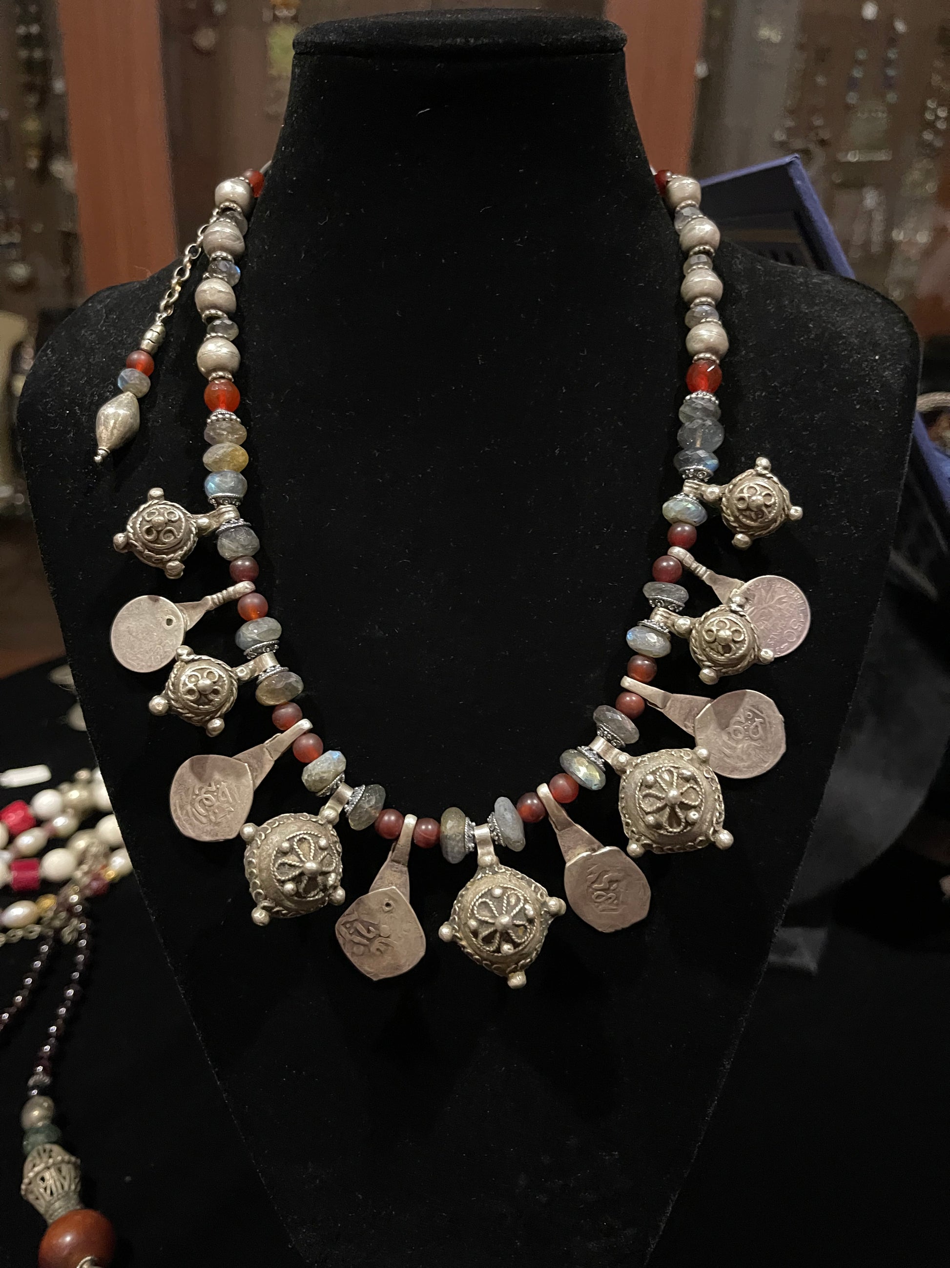Silver pendants from Morocco, silver coin pendants and labradorite beads, carnelian beads and old silver beads on silver tubes