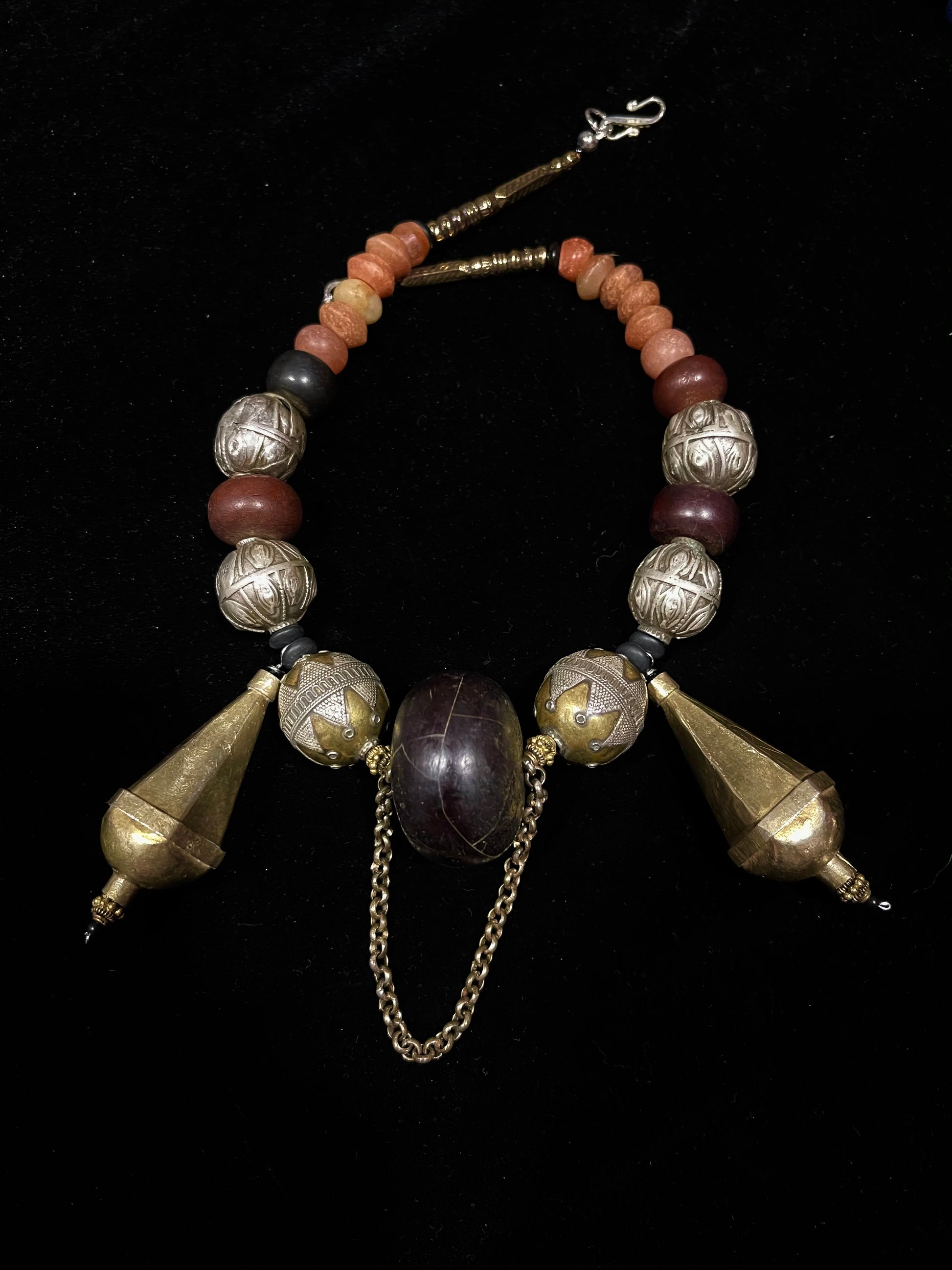 2 Antique Moroccan silver perfume holders, Strung with Black phenolic resin, Yemeni silver beads and old agates.
