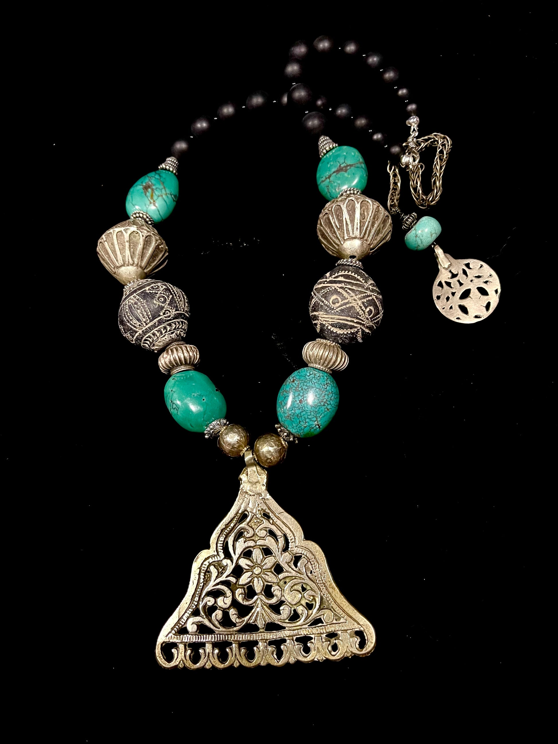 Vintage Moroccan silver pendant strung with old Mali Clay beads, turquoise and old Berber silver beads