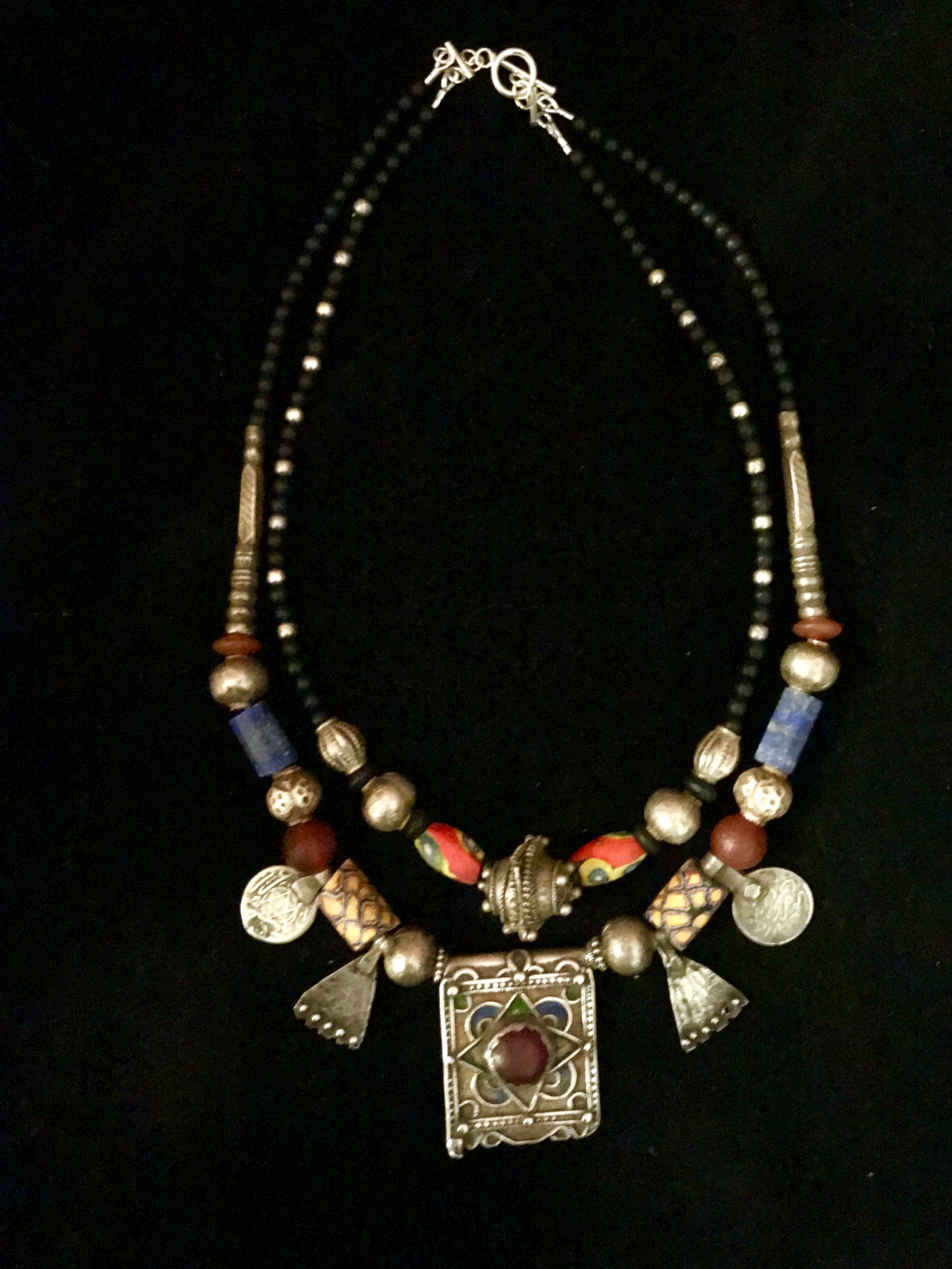 This necklace features an antique enamelled pendant with an inset of old red glass, antique little silver pendants, old venetian millefiori beads and old silver beads.