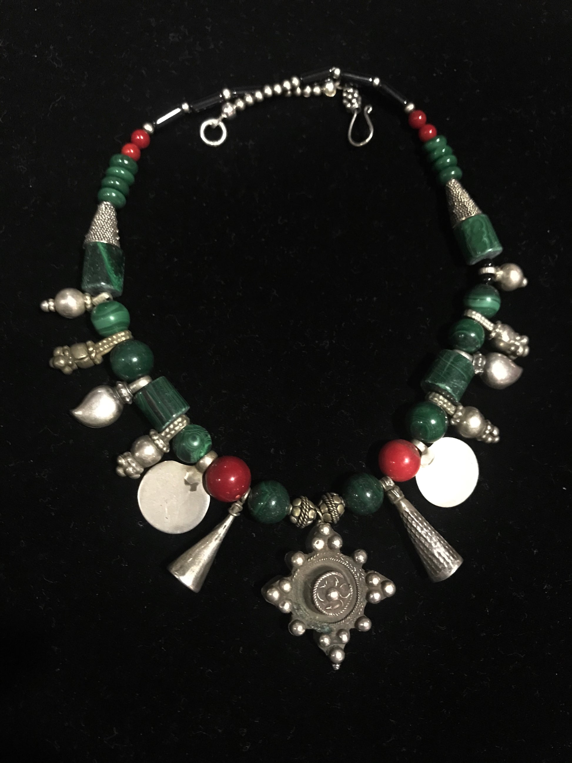 amulets from Morocco (the central pendant and the 2 conical pendants) Yemen, India, strung with Malachite, Bamboo coral and silver